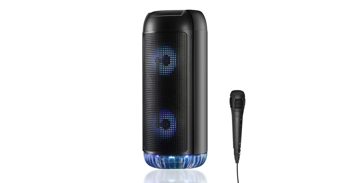 This Bluetooth speaker is perfect for any party or karaoke night! Enjoy powerful sound with 30W RMS (600W PMPO), built-in mood lighting, and 6 hours of playtime on a single charge. Start your karaoke party right away with the included microphone! 🎉
