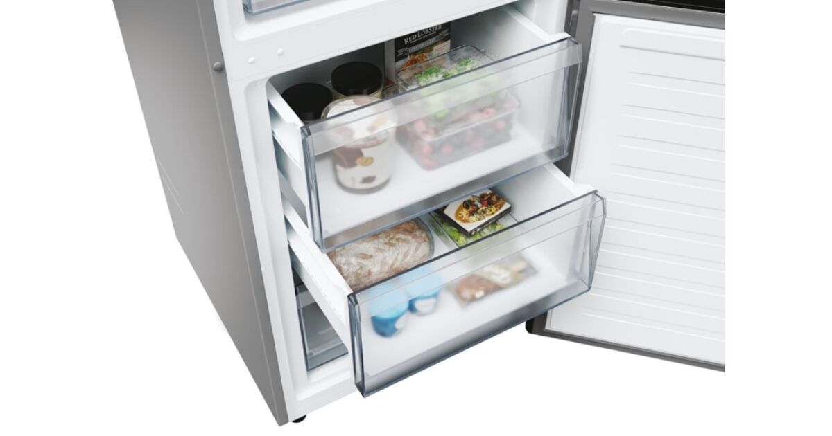 Extra space 60 cm wide This combi fridge can hold up to 18 grocery bags thanks to its 355-litre, 60 cm wide capacity. Plus, thanks to the large freezer drawers, there's more space to store even the heaviest items. The comparison is intended to give an immediate understanding of the actual capacity of the product, assuming that the shopping bags are filled to capacity and that the contents can be stored in any space in the product area. Overfilling is not recommended and the product should be used in accordance with the instructions for use. The capacity of the bags is based on the volume of an average medium sized shopping bag in the UK (source: Environment Agency of UK Government, 2011). The capacity of the refrigerator is calculated at normal use setting with all shelves and accessories in place.