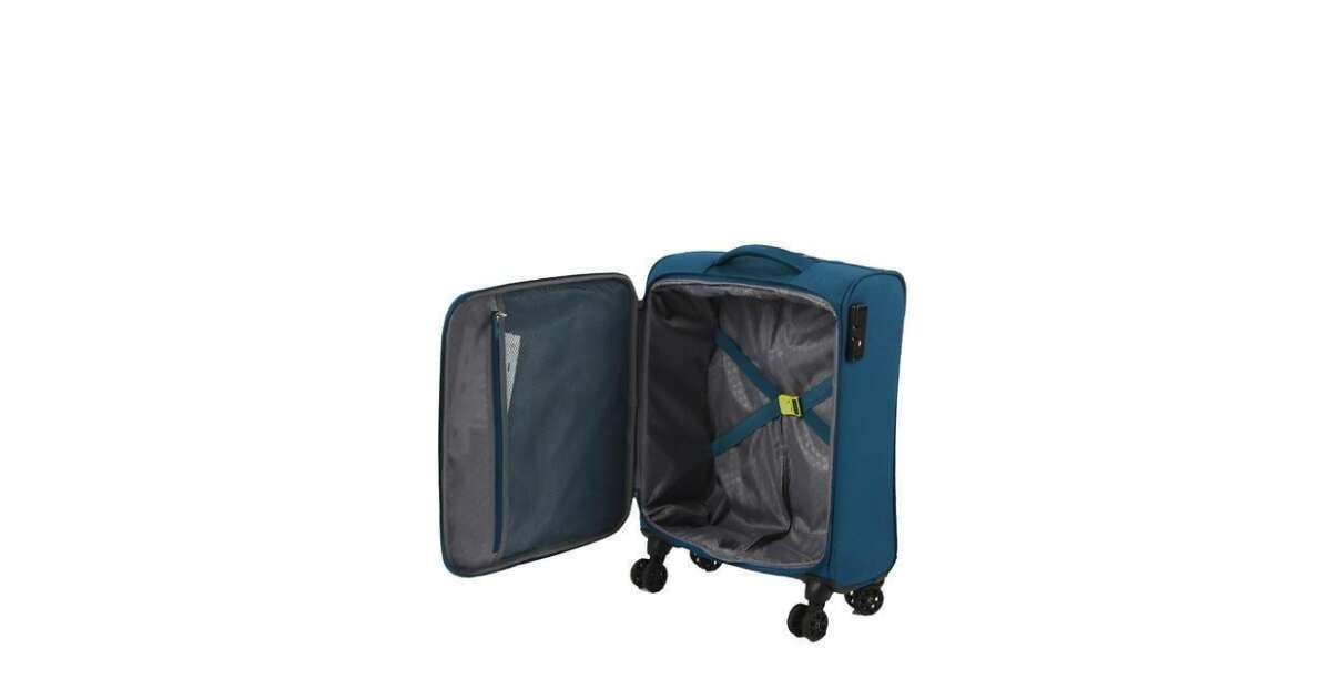 Features: - Available colours: greenish blue-lime, black-grey - Outer material: polyester - Size: 55 x 40 x 20 cm - Size: cabin trunk - Capacity: 38 L - Weight: 2,59 kg - Material information: soft touch - Lock: fixed 3-digit combination lock with TSA function - Standard zippers - Handles: top handle - Number of wheels: 4 wheels - External pocket: 1 front pocket - Bottom compartment with straps - Top compartment - Internal divider: top compartment - Fixing straps: in lower compartment - Warranty: 2 years global warranty