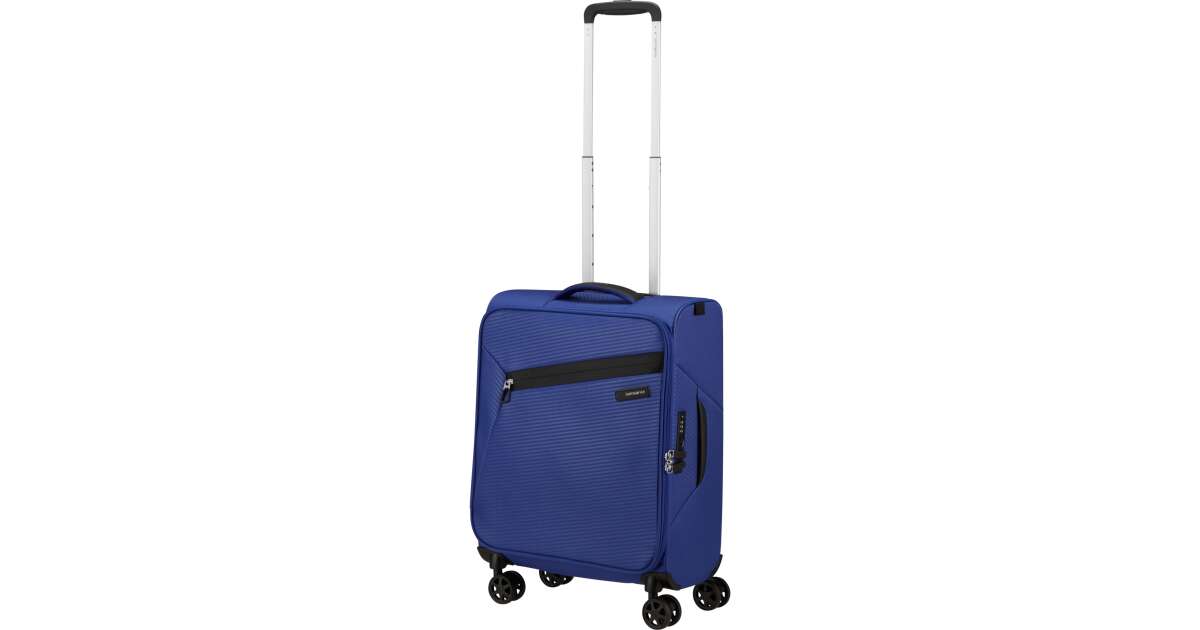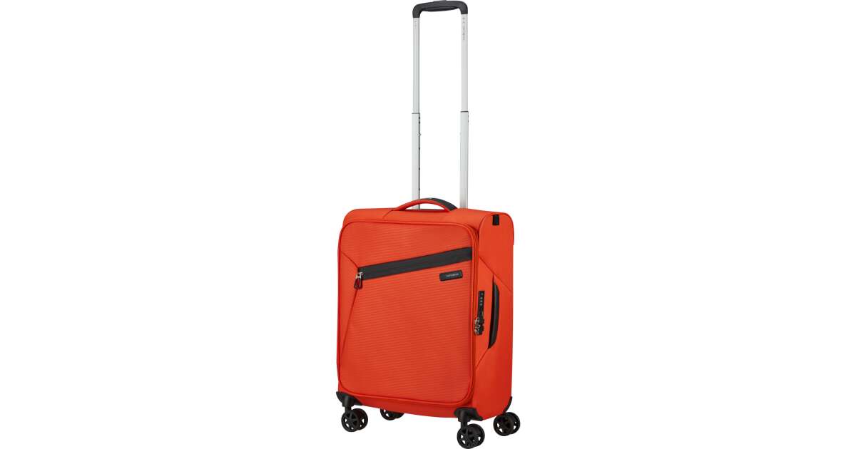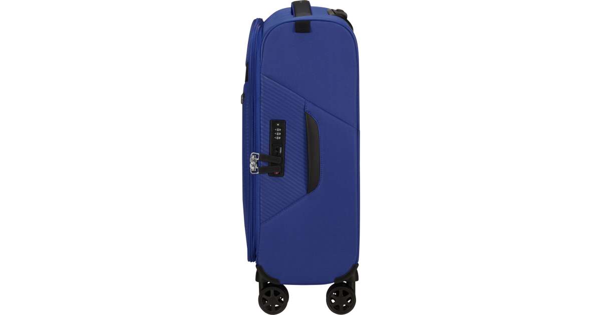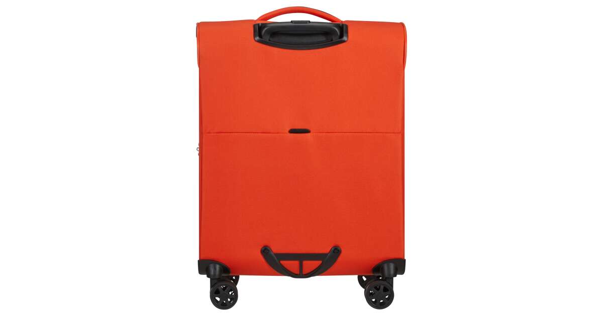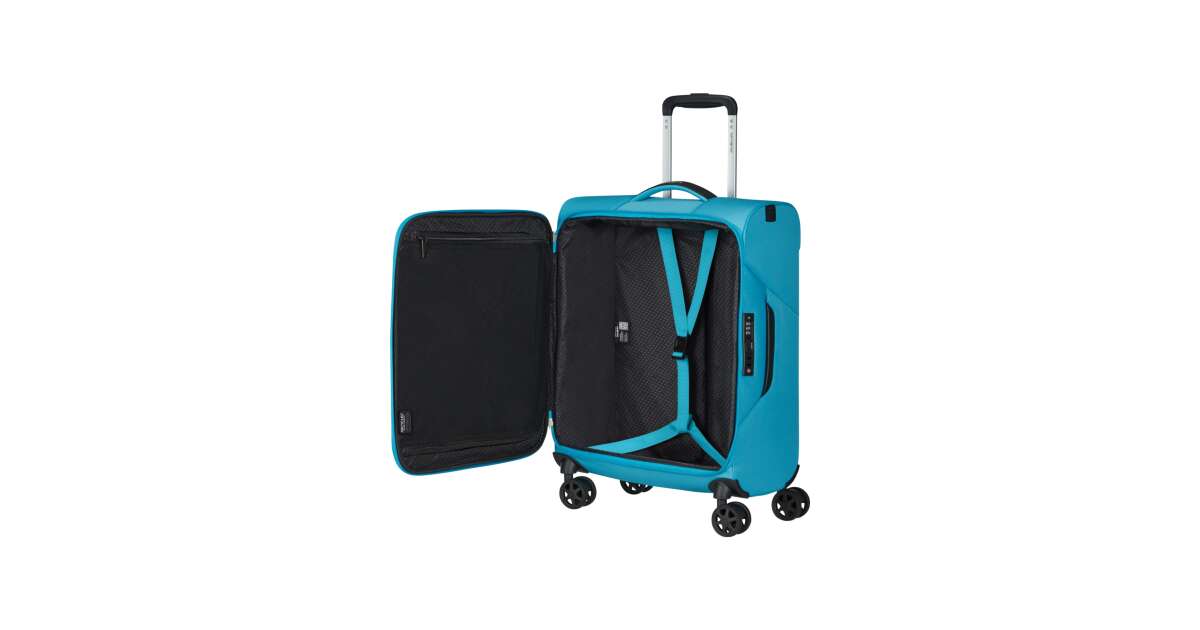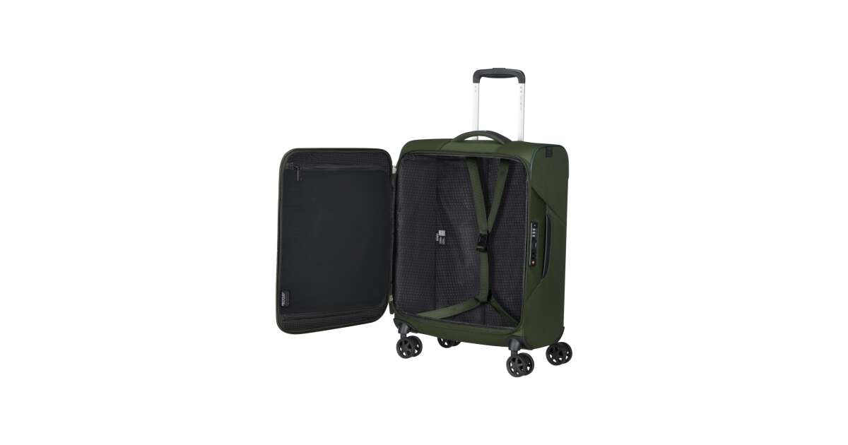 Features: - Available colours: green, dark blue, black, blue, orange, light blue - Model: spinner (4 wheels) - Outer material: polyester - Inner material: made from consumer recycled PET bottles using our Recyclex™ material technology - Size: 55 x 40 x 20 cm - Size: cabin trunk - Capacity: 39 L - Average packing capacity: approx. 10 kg - Weight: 1,8 kg - Material information: soft touch - Lock: built-in 3-digit TSA lock - Zippers: colour matching zipper - Handles: top handles - Pull handle: double lock - Number of wheels: 4 wheels - Wheels: double wheel - External pockets: 1 front zipped pocket - Bottom compartment: bottom compartment with colour-matched straps - Upper compartment: upper compartment with mesh dividers - Bottom handle for easy carrying - Tag holder: integrated ID Tag - Warranty: 5 years global warranty