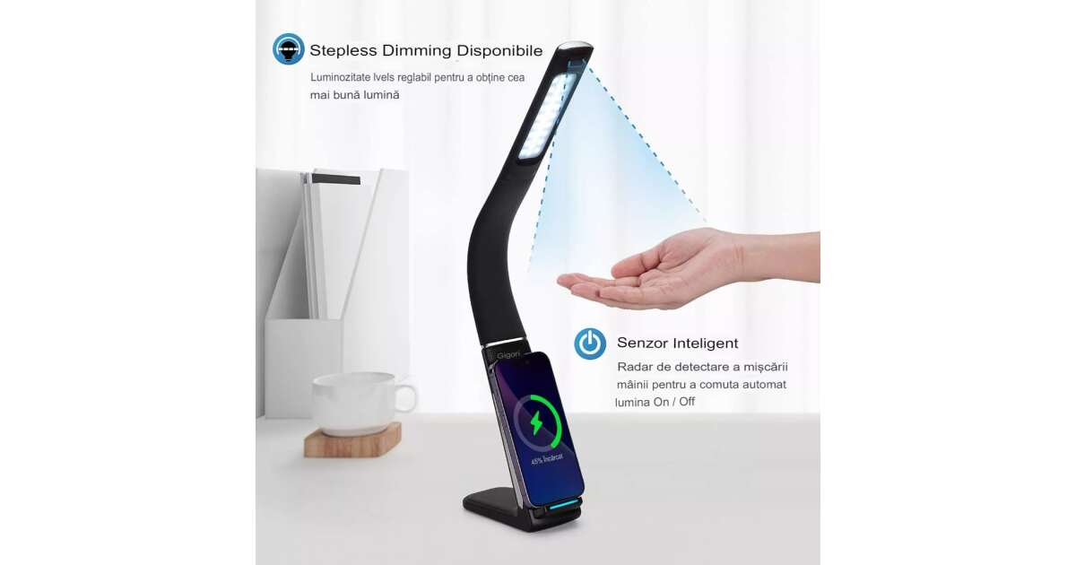 This modern LED desk lamp is perfect for home or office use. Thanks to its flexible arm and gesture control, you can easily adjust the brightness and direction of the light. And with the built-in wireless charger, you can conveniently charge your smartphone.