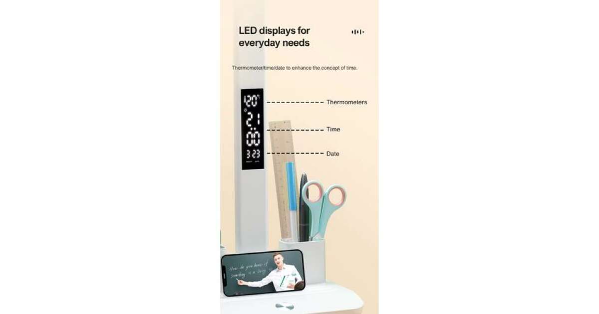 LED Desk Lamp with Built-in Battery, Date, Time, and Temperature Display, Adjustable Lighting Angle description of