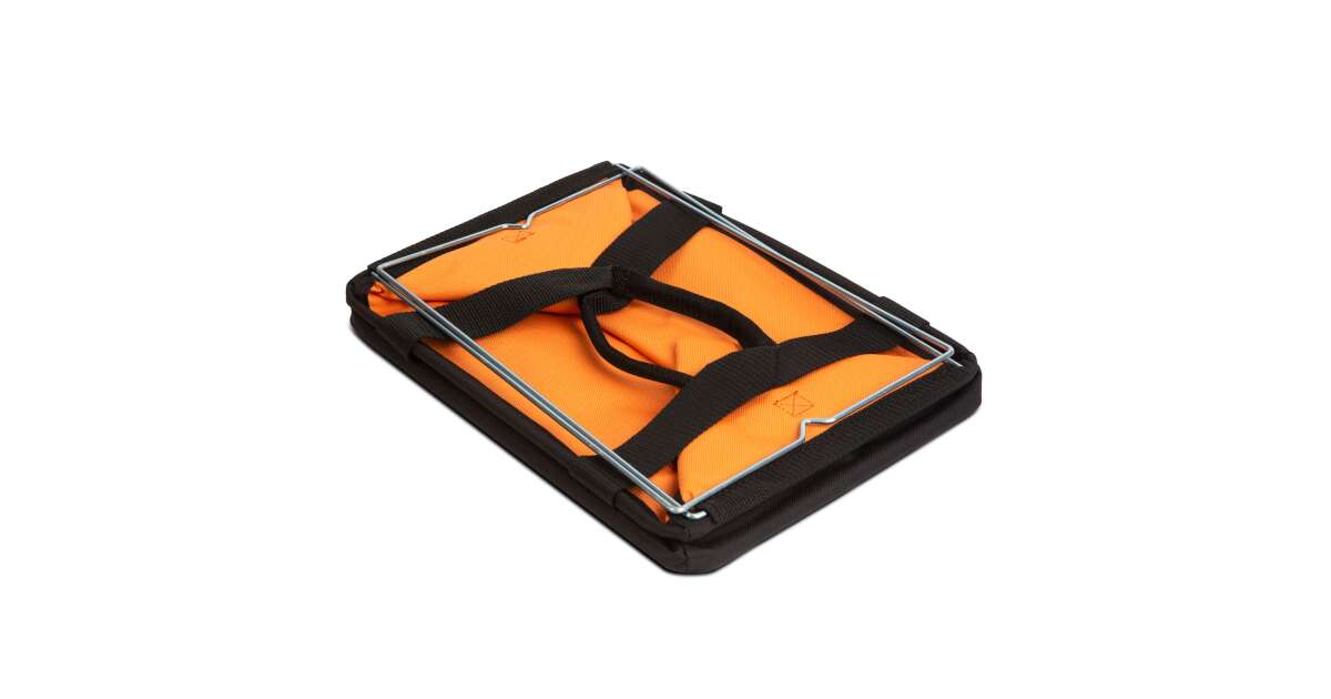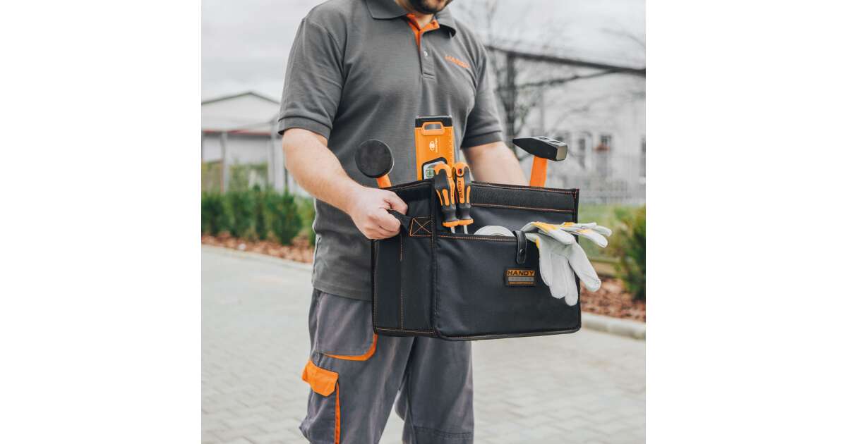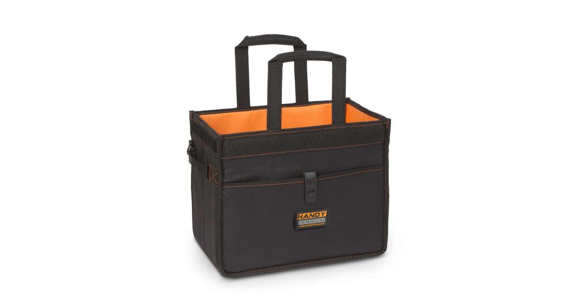 This Handy brand foldable tool bag is perfect for any professional who appreciates durable construction and practical storage options. It has a rigid frame, a Velcro closure, and is made of thick, water-repellent material, protecting your tools in any weather.