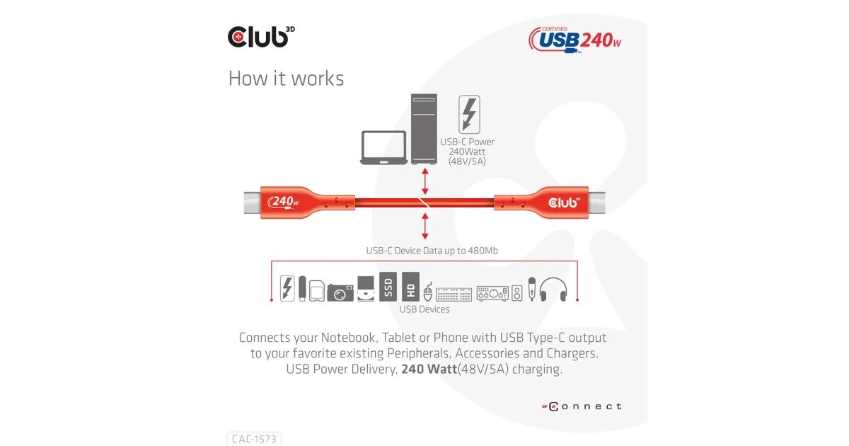 Club3D USB-C Cable: 240W Charging and 480Mbps Data Transfer ⚡