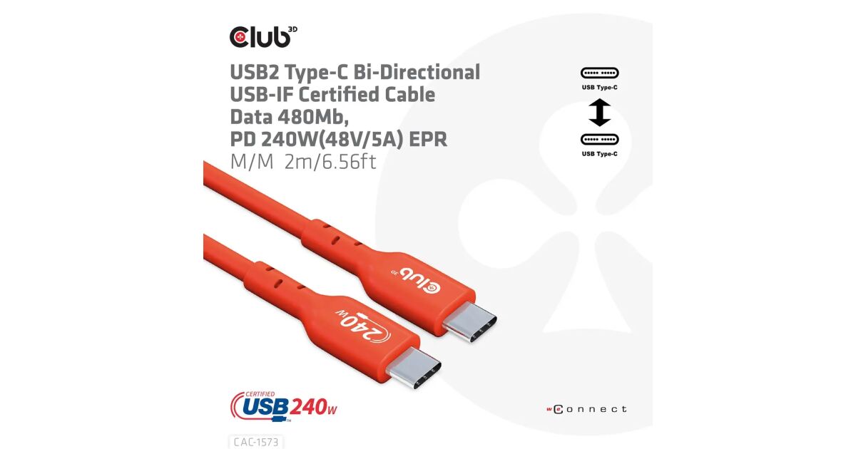Kab club3d usb2 type-c bi-directional usb-if certified cable, data 480mb, pd 240w(48v/5a) epr m/m 2m - 6.56ft description of