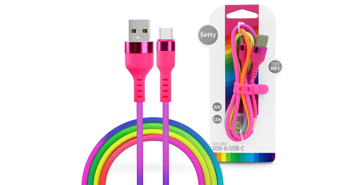 This Setty Rainbow USB-C cable is perfect for your modern devices, whether it's a smartphone, tablet, or any other device with a USB-C connector. The cable's 1.2-meter length makes it super convenient to use, while its rainbow design will brighten up your day.