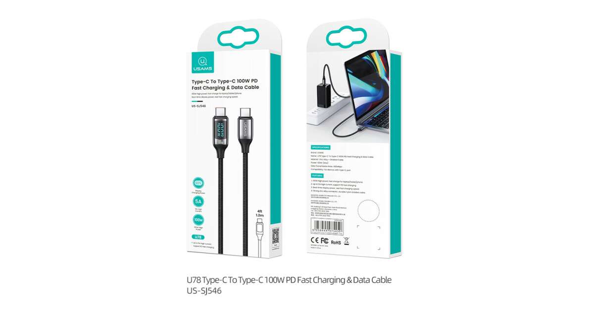 -USAMS - U78 Data Cable (US-SJ546) - Type-C - Type-C 100W, PD, Fast Charging, 1.2 m - Black (KF236922) description of