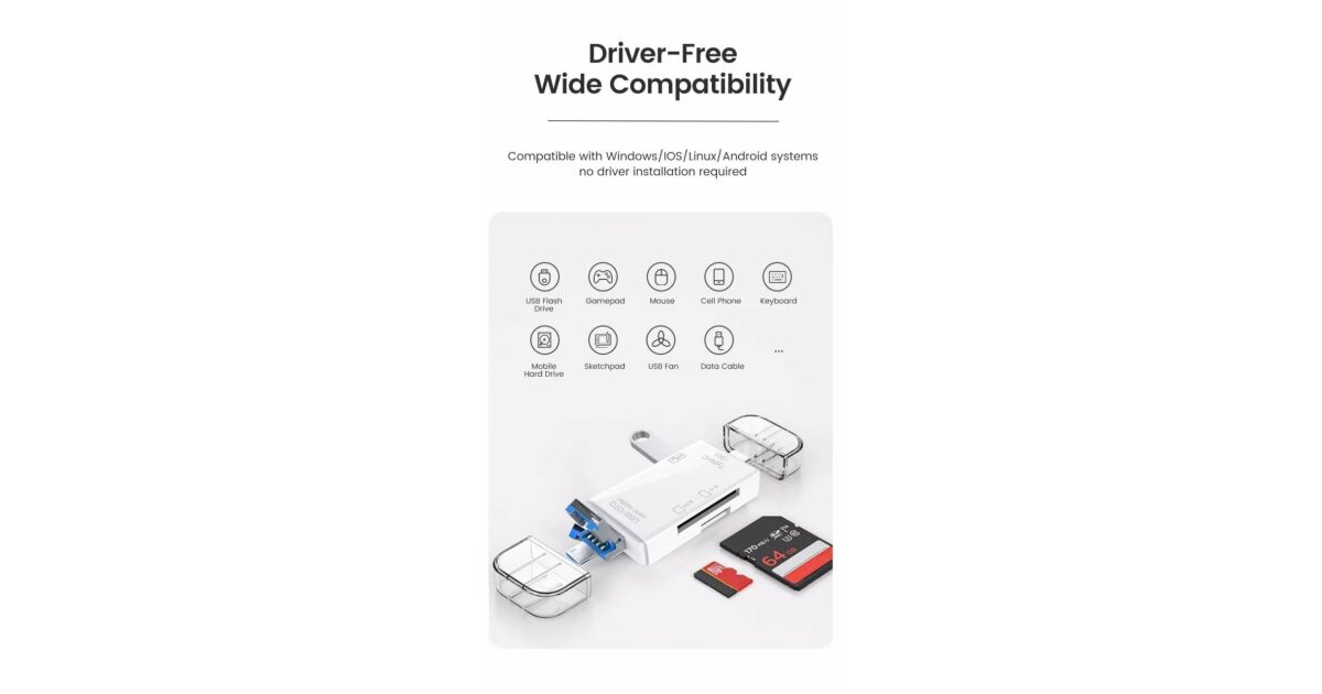 - 5-in-1: USB-A, Micro-USB, USB-C, SD and microSD card reader