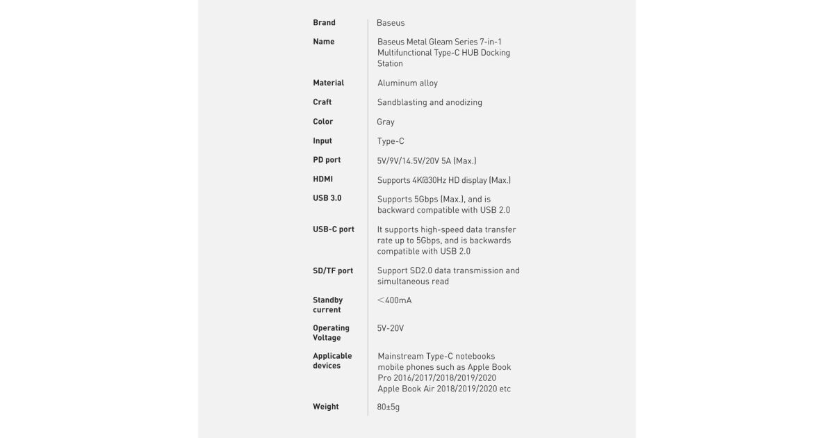 Baseus adapter 7-in-1 USB-C hub 2x USB 3.0 + HDMI + USB-C PD description of