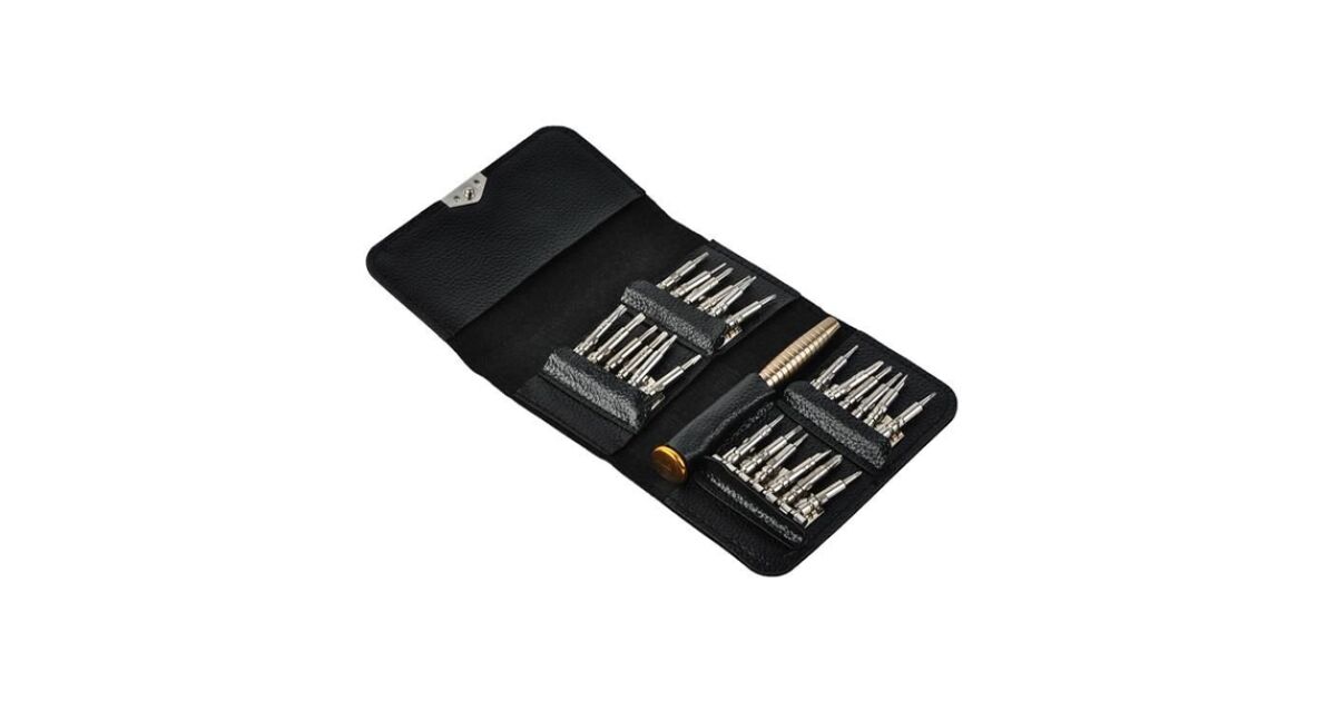 This 25-in-1 precision screwdriver set has all the tools you need to repair phones, smartphones, laptops, and other small electronics. The set includes 24 different sized and types of screwdriver bits and an ergonomic handle, all neatly stored in a stylish, magnetic eco-leather case.