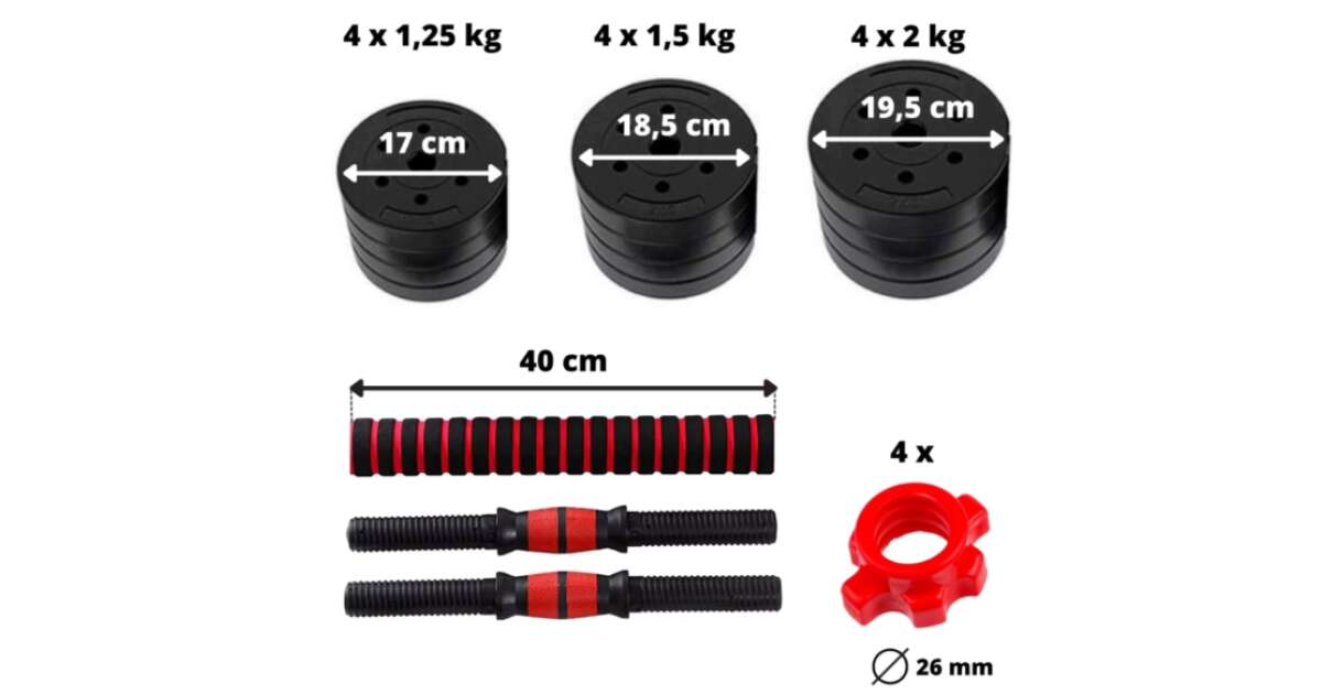 - Adjustable weight: 12 plates (4 x 1.25 kg, 4 x 1.5 kg, 4 x 2 kg) ensure gradual weight increase.