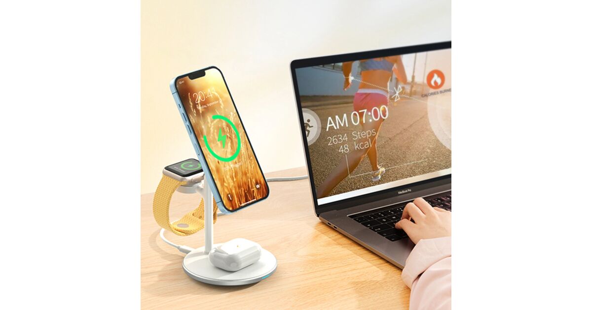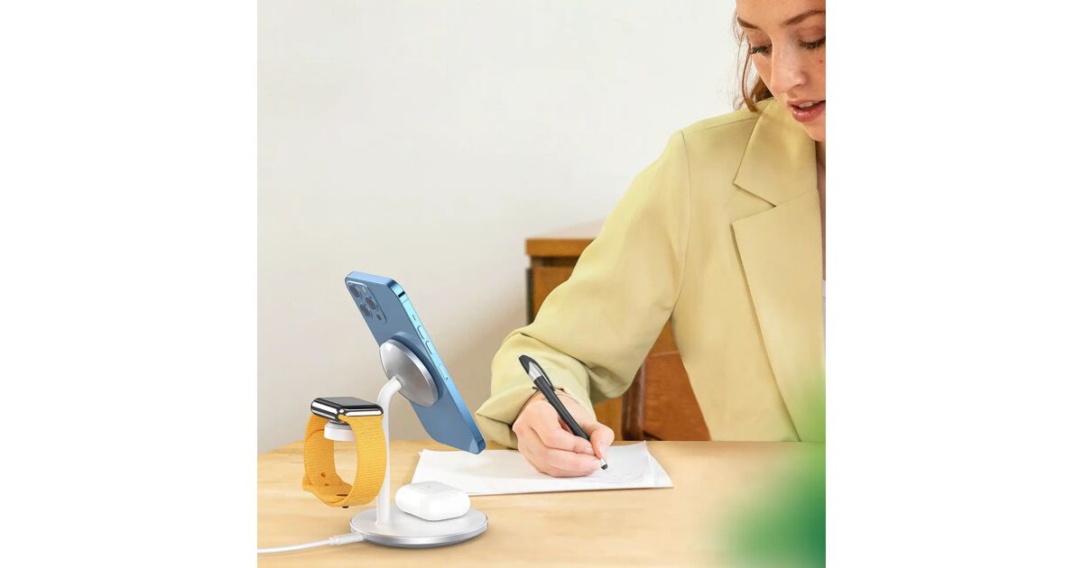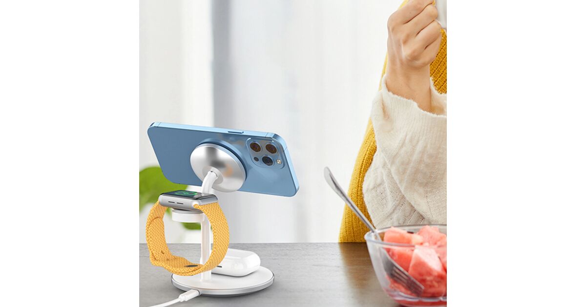 This handy charging station can wirelessly charge three Apple devices simultaneously: iPhone (12-14 series), AirPods Pro, and Apple Watch. The built-in magnets securely hold your phone, while allowing you to comfortably use it for watching videos or online conversations.