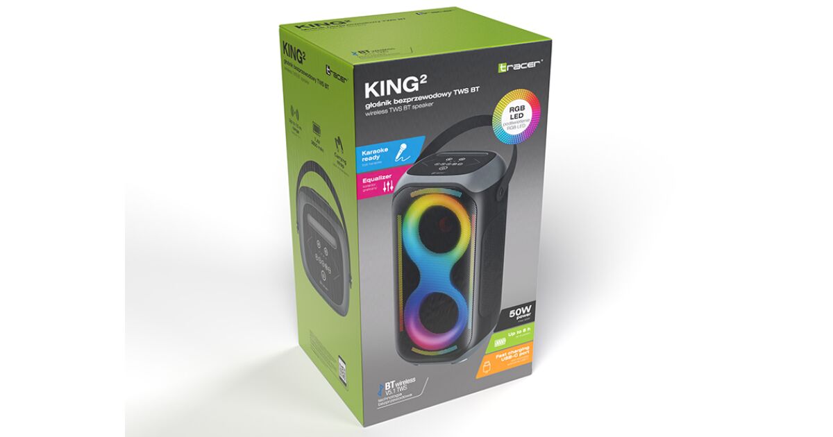 TRACER Poweraudio King 2 BT TWS je moćan, prijenosni zvučnik, savršen za zabave, druženja i karaoke večeri. Uživaj u bežičnoj slobodi, impresivnom zvuku i spektakularnim RGB svjetlosnim efektima!