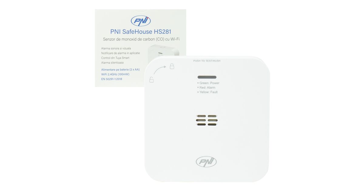 Senzor ugljičnog monoksida (CO) PNI SafeHouse HS281 s Wi-Fi, upravljanje iz aplikacije Tuya Smart, napajanje AA baterijom, 85 dB, zvučni i vizualni alarm, tihi alarm