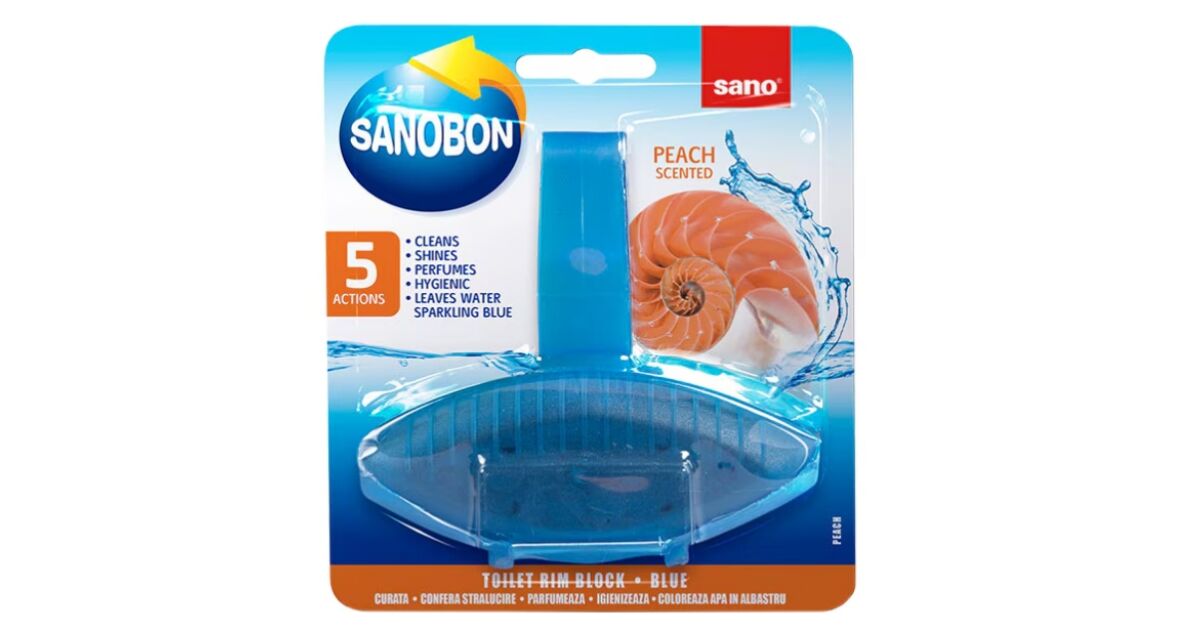Uživajte u svježem i čistom WC-u uz Sano Bon Blue Peach 5-u-1 osvježivač! Ovo pakiranje sadrži 3 osvježivača za WC školjku od 55 grama koji čiste, poliraju, dezinficiraju, osvježavaju i boje vodu u plavo.