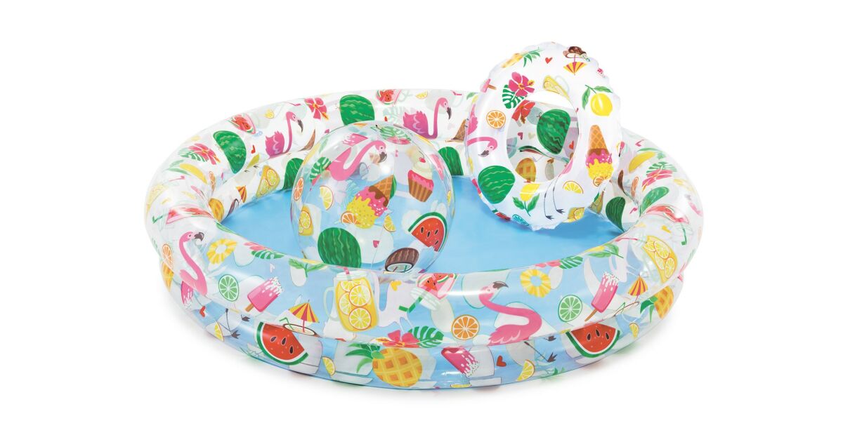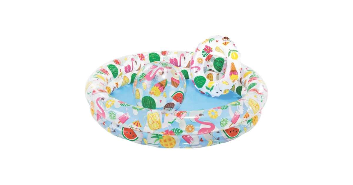 Ovaj veseli set bazena na napuhavanje s voćnim uzorkom savršen je za vruće ljetne dane! Njegova mala veličina idealna je za vrt ili terasu, tako da mališani mogu uživati u osvježavajućem brčkanju u bilo kojem trenutku. Set uključuje bazen od 122x25 cm, loptu na napuhavanje od 51 cm i kolut za plivanje od 51 cm, što jamči zabavu!