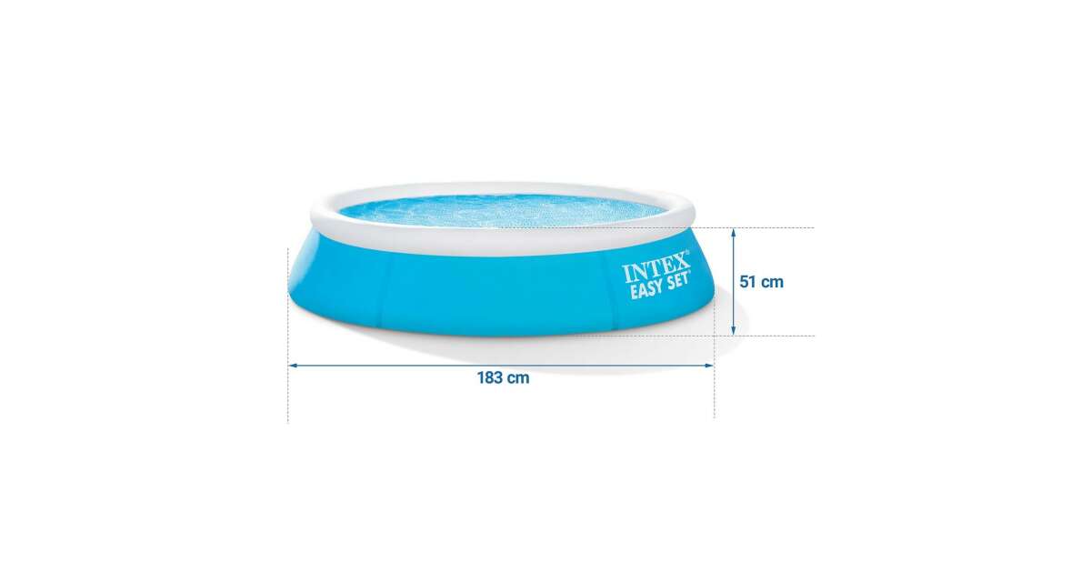 Uživajte u ljetnim vrućinama s ovim lako postavljivim Intex Easy Set bazenom! Bazen promjera 183 cm i visine 51 cm prima 886 litara vode (pri 80% punjenja). Postavljanje traje samo 15 minuta, tako da brzo možete uživati u pljuskanju. Robusni bazen izrađen od 3-slojne SUPER-TOUGH folije iznimno je stabilan i siguran. Kupci ističu izvrsnu kvalitetu proizvoda i brzo, bezbrižno postavljanje.
