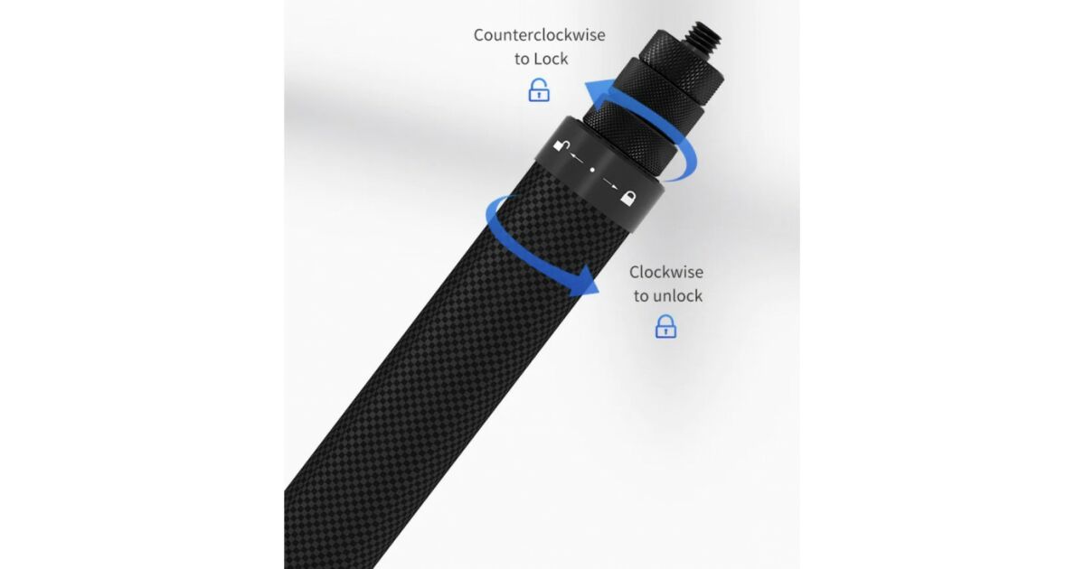 Glavna šipka Telesin glave štapa izrađena je od karbonskih vlakana, lakšeg, jačeg i puno izdržljivijeg materijala od aluminija. Može se koristiti za ronjenje, vlagu, kabel je prisutan u usporedbi s proizvodima izrađenim od drugih materijala. Može se proširiti za 1,16 metara, što je zlatna udaljenost za panoramsku fotografiju kamerom. Ima četiri načina rada: (25 cm, 56 cm, 86 cm i 116 cm) koji pružaju svestranost snimanja kako bi zadovoljili vaše različite potrebe. Višestruki prstenovi za pozicioniranje, stabilni i vrlo čvrsti. Nakon što se rastegne na ispravnu duljinu, okrenite ga suprotno od smjera kazaljke na satu da biste zaključali prsten za zaključavanje, a u smjeru kazaljke na satu da biste ga otpustili. Na dnu se nalazi rupa za vijak od 1/4, tako da se selfie štap može pričvrstiti na većinu fotoaparata i stativa. Na vrhu se nalazi vijak od 1/4: koji se može koristiti s adapterima za pričvršćivanje raznih uređaja. U smanjenom obliku dug je samo 25 cm i ima neto težinu od 82 g, što ga čini jednostavnim za transport. Ako koristite panoramsku kameru, selfie stick postaje nevidljiv tijekom fotografiranja/snimanja.