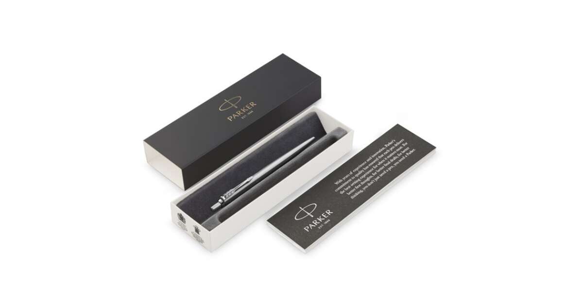 PARKER Royal Jotter kemijska olovka je bezvremenska klasika, poznata diljem svijeta po svojoj kvaliteti, izdržljivosti i odličnom omjeru cijene i kvalitete. Dizajnirao ju je László Moholy-Nagy, a njezin elegantan i čist dizajn čini je savršenim izborom za sve dobne skupine.
