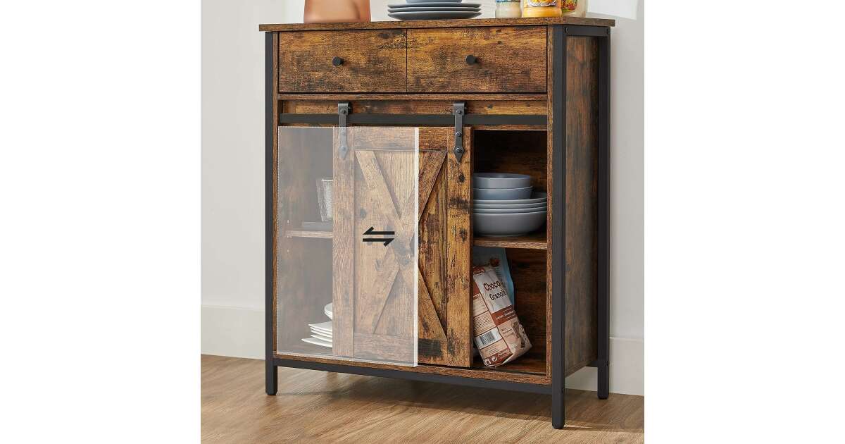 Ovaj stilski i praktični VASAGLE ormarić s ladicama savršen je izbor za dnevni boravak ili kuhinju, s elegantnim rustikalnim izgledom i prostranim prostorom za pohranu. Dvije ladice i klizna vrata pružaju dovoljno mjesta za vaše stvari, dok podesive police omogućuju personalizaciju unutarnjeg rasporeda.