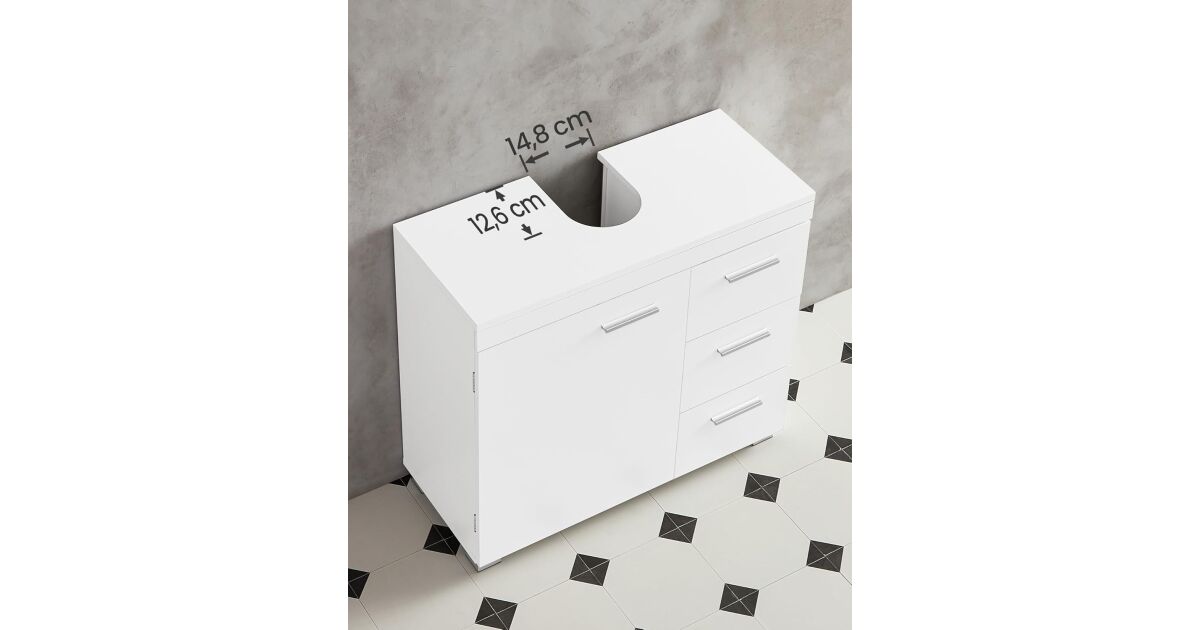 Ovaj bijeli VASAGLE ormarić ispod umivaonika nudi ti hrpu prostora za sve tvoje kupaonske potrepštine. S tri prostrane ladice i dva pretinca, lako ćeš organizirati kozmetiku, ručnike i ostale sitnice. Praktične nogice štite ormarić od vlage, a površina koja se lako čisti garantira higijenu.