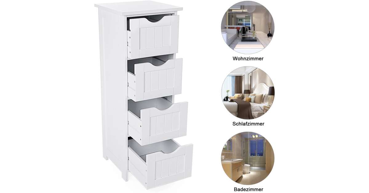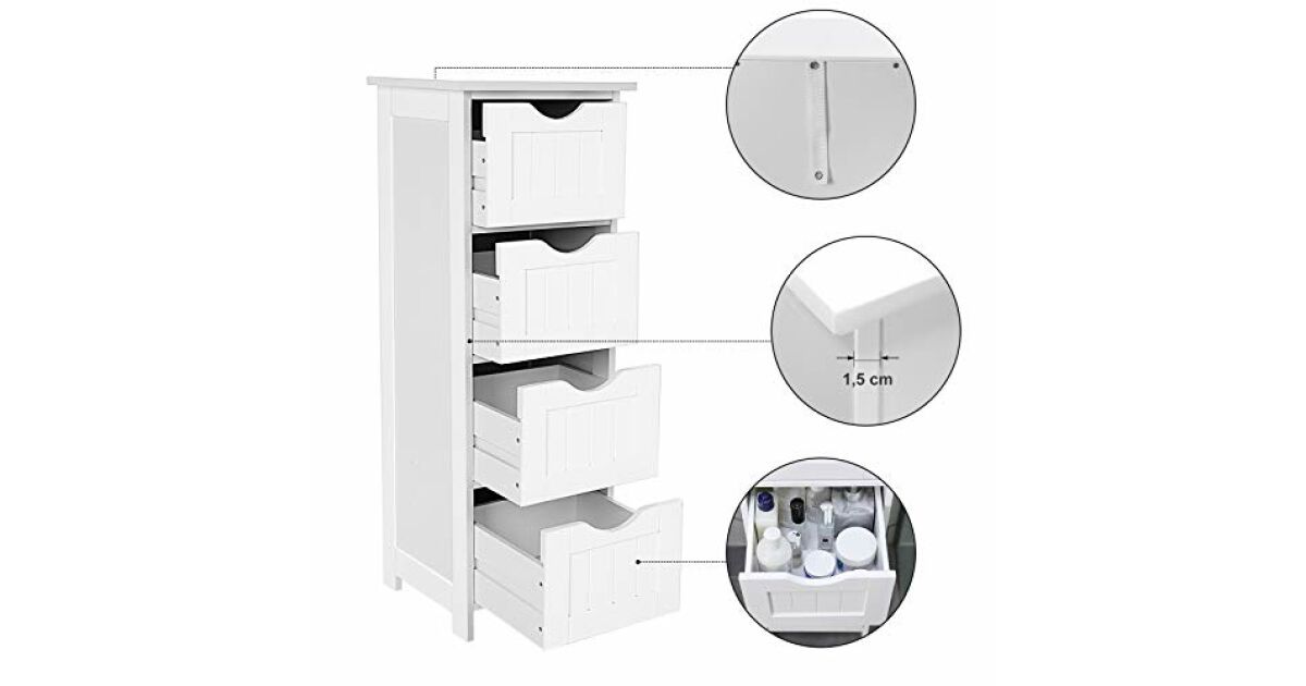 Ovaj elegantni i praktični VASAGLE kupaonski ormarić savršeno je rješenje za organizaciju vaše kupaonice. U četiri prostrane ladice lako možete smjestiti ručnike, kozmetiku i ostale potrepštine. Čist, bijeli dizajn savršeno se uklapa u svaku kupaonicu, bilo da se radi o klasičnom ili modernom stilu.