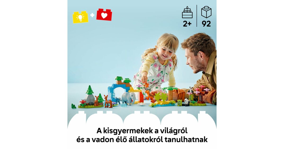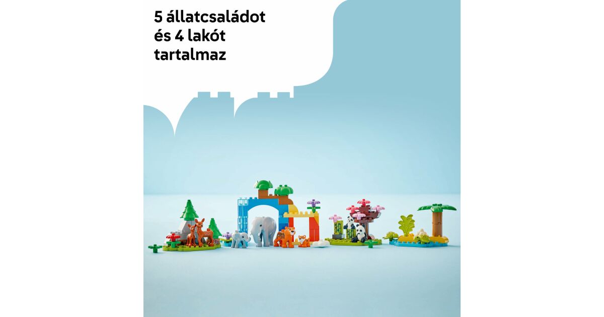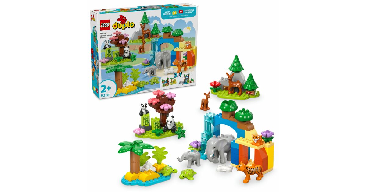 Ovaj LEGO® DUPLO® set od 92 komada omogućuje gradnju 3 različita staništa divljih životinja: savane, obale i šume. Svako stanište uključuje obitelj životinja: slonove, tigrove, pande, jelene i kornjače.