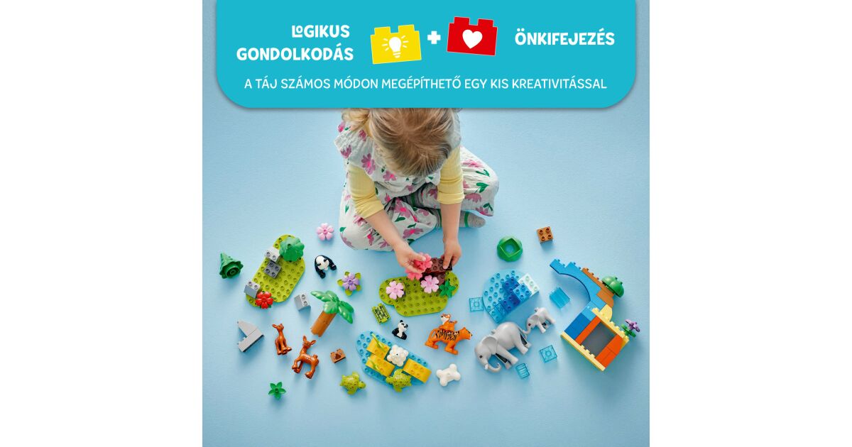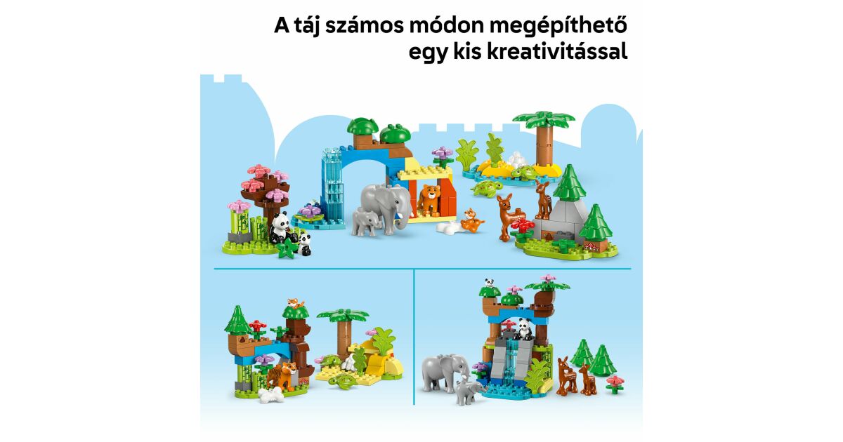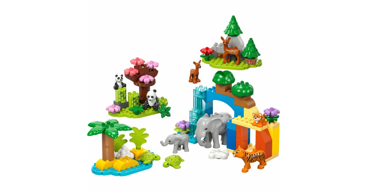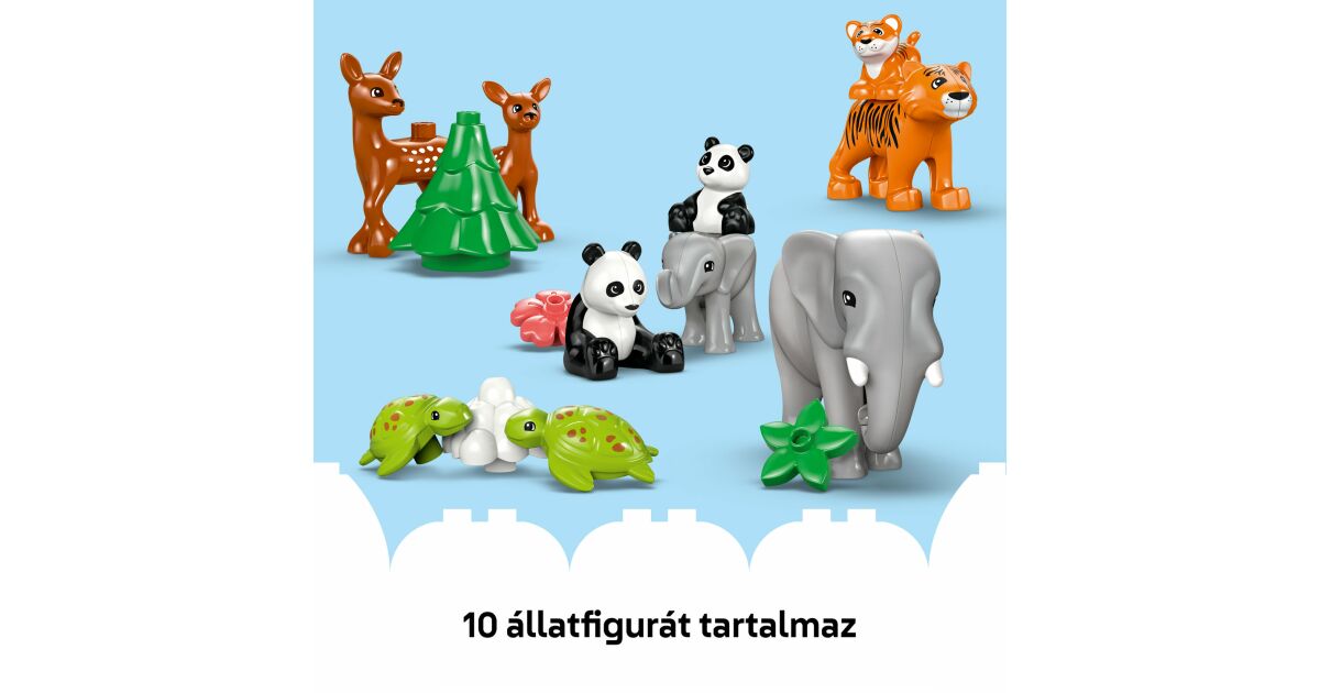 - 10 preslatkih LEGO® DUPLO® životinjskih figurica: Tigar, slon, jelen, panda i njihove mladunčadi, te 2 kornjače.