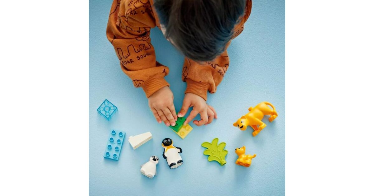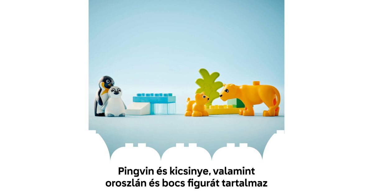 Ovaj zabavni LEGO® DUPLO® set savršen je izbor za djecu stariju od 2 godine koja vole životinje i gradnju. U setu se nalaze dvije obitelji pingvina i dvije obitelji lavova, te šarene DUPLO kocke od kojih možete sagraditi tobogan od leda i travnato područje.