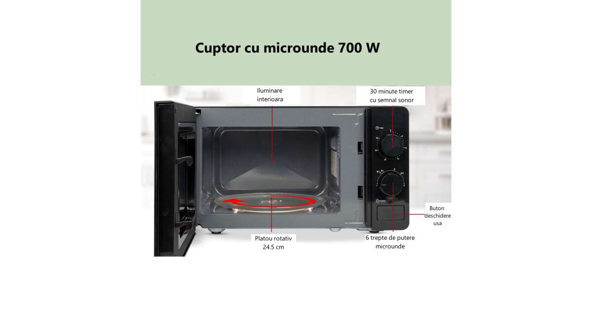 Mikrovalna pećnica Bomann, MW6014CBN, 700 W, 20 litara, 6 razina snage, odmrzavanje, grijanje, timer, zvučni signal, unutarnje osvjetljenje, rotirajući tanjur 24,5 cm, lako čistiv unutrašnjost, crna s opisom