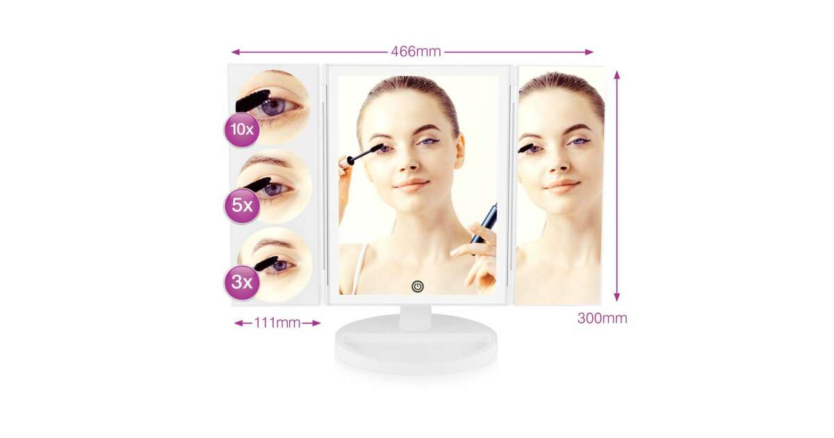 RIO MMFS sklopivo kozmetičko ogledalo, LED rasvjeta, nagib, rotacija 360°, 1x, 3x, 5x, 10x zoom, 4xAAA/USB, bijelo s opisom