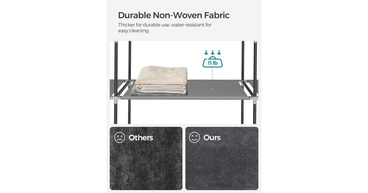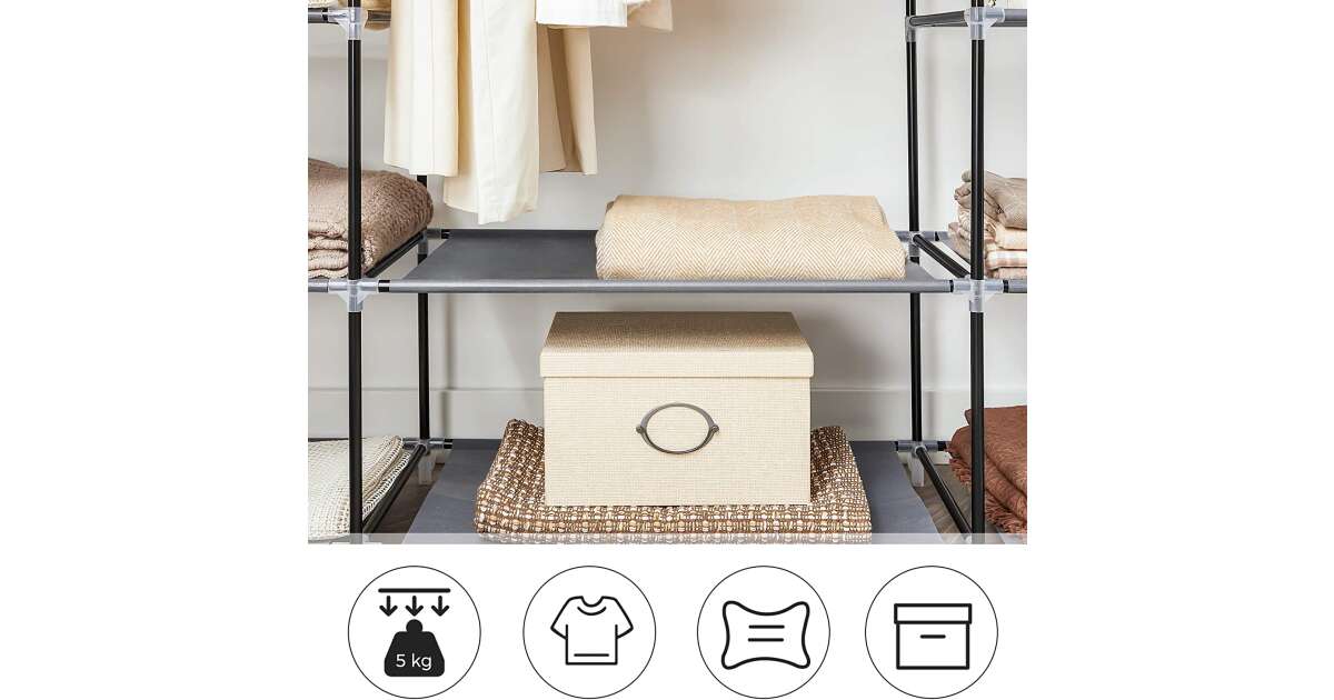 - Izdržljiv: Čvrsti metalni okvir i izdržljiva tkanina koja se lako čisti. Prema iskustvima kupaca, ormar dobro podnosi opterećenje.