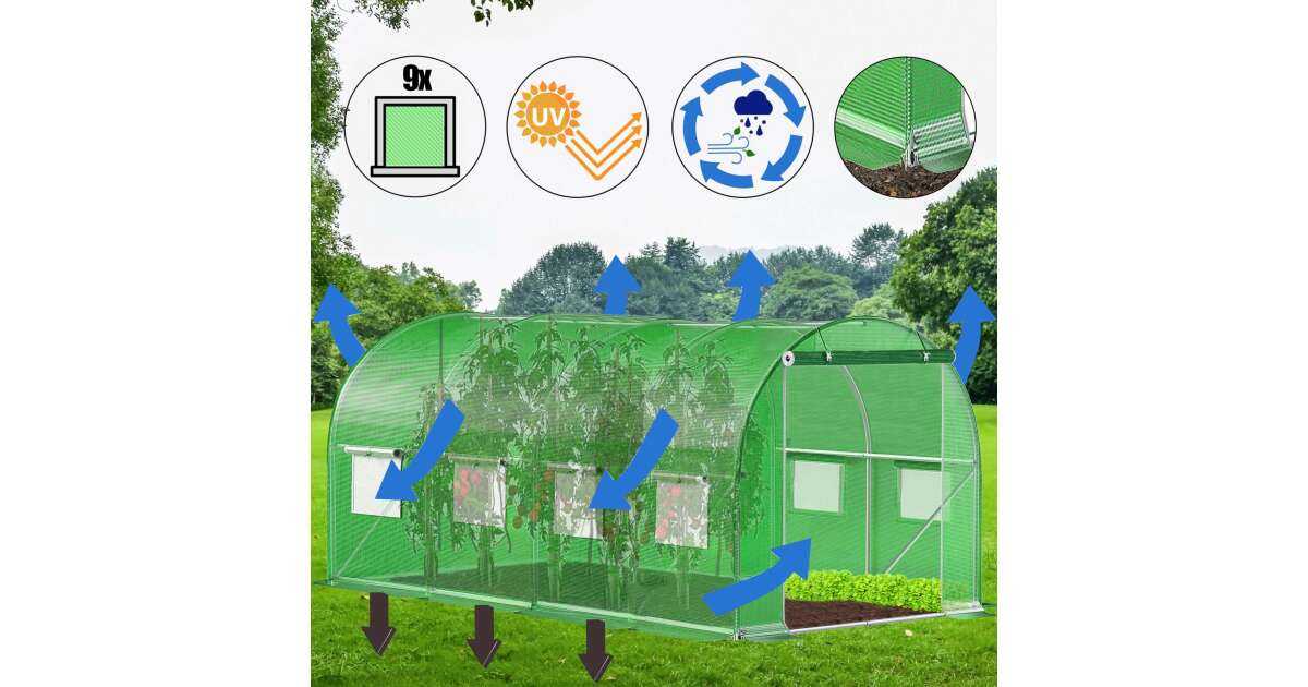 Zaštitite svoje biljke: Folijski tunel štiti vaše biljke od vjetra, kiše i štetnika, osiguravajući tako bogat urod. Zelena folija ima optimalnu propusnost svjetlosti, potičući zdrav rast biljaka.