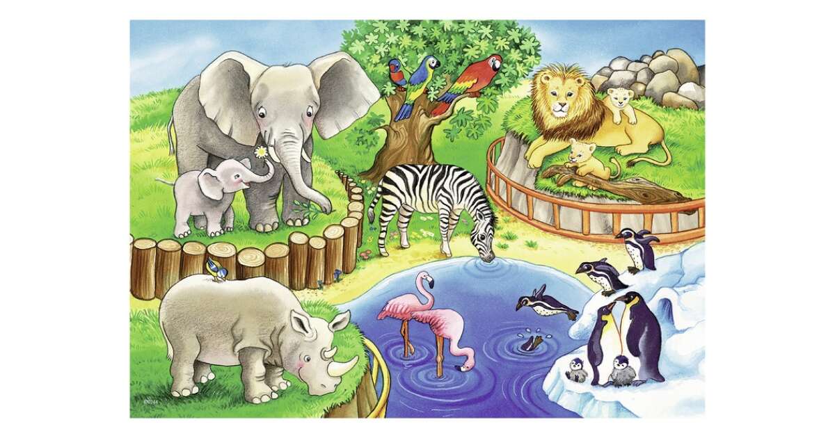 Otkrijte Ravensburger puzzle Životinje u zoološkom vrtu 2 x 12 dijelova koje sadrže dva seta od 12 puzzli! S dva različita, šarena i vesela prizora iz zoološkog vrta, ovo je savršena zabava za mališane.