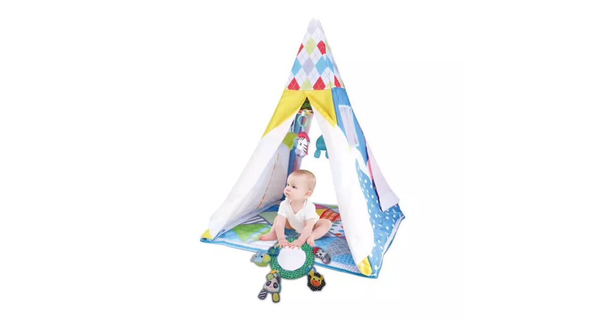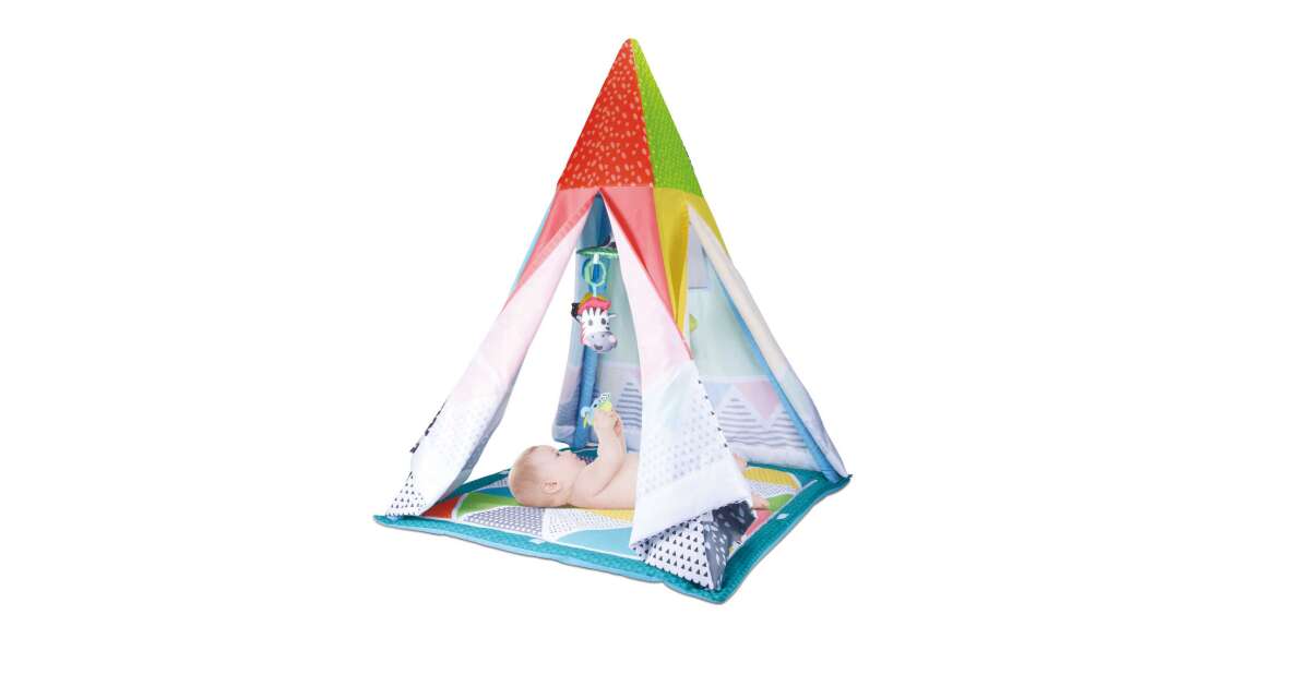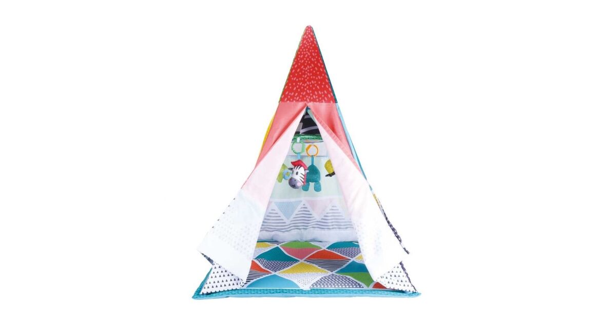Ovaj šareni šator s točkicama savršeno je mjesto za igru i odmor za najmlađe. Izrađen je od izdržljive, čvrste plastike, tako da se može koristiti u zatvorenom i na otvorenom. Mekana podloga pruža udobno mjesto za bebu, a odvojive zvečke čine igru zabavnom. Tri stranice se mogu otvoriti, što olakšava pristup bebi.