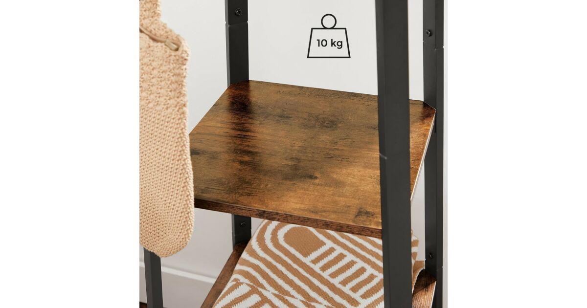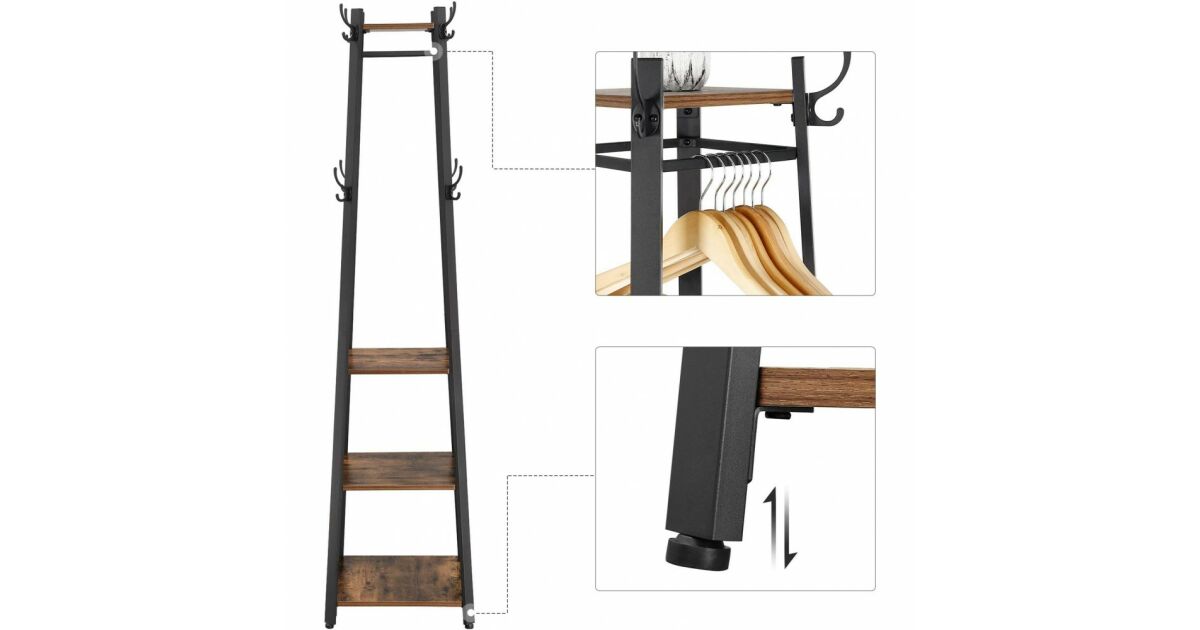 Ovaj elegantni i praktični stalak za kapute u rustikalnoj smeđoj boji izrađen je od iverice i željeza. Savršen je izbor za ulaz, hodnik ili čak spavaću sobu. Tri police i gornje kuke pružaju dovoljno prostora za kapute, jakne, kape, torbe i ostale dodatke.