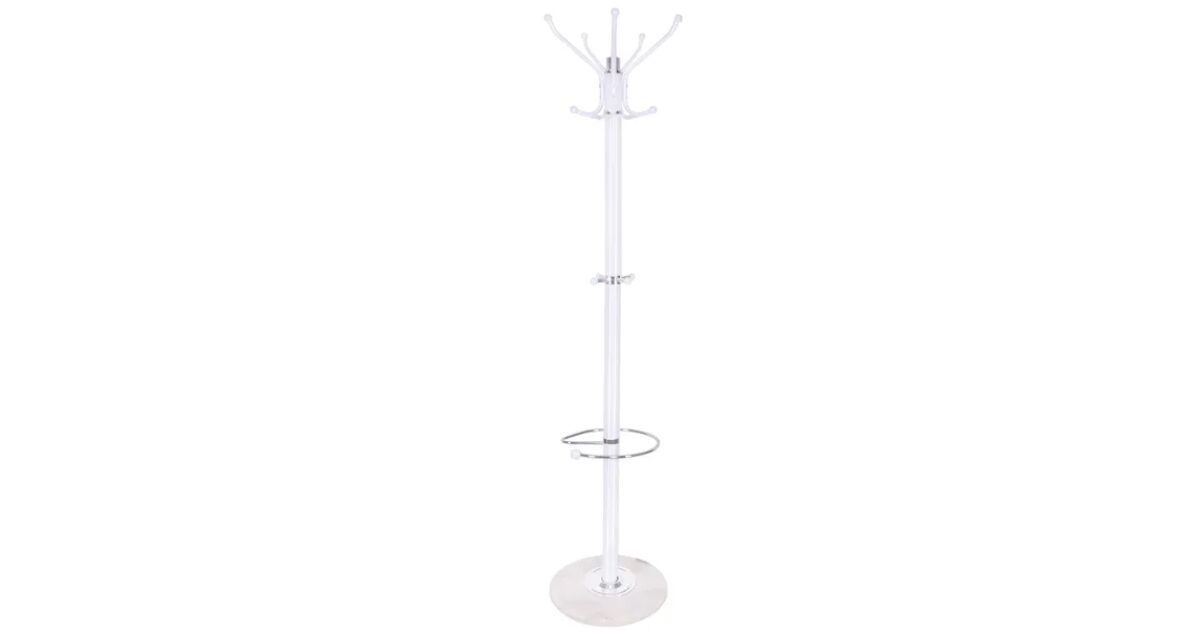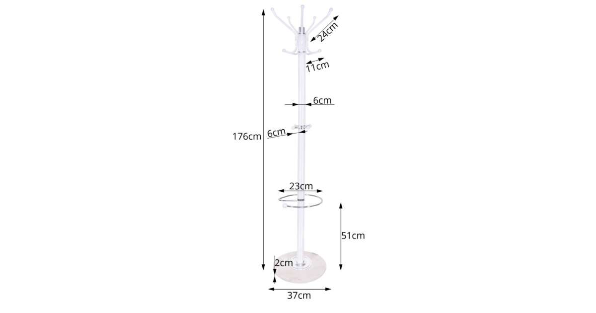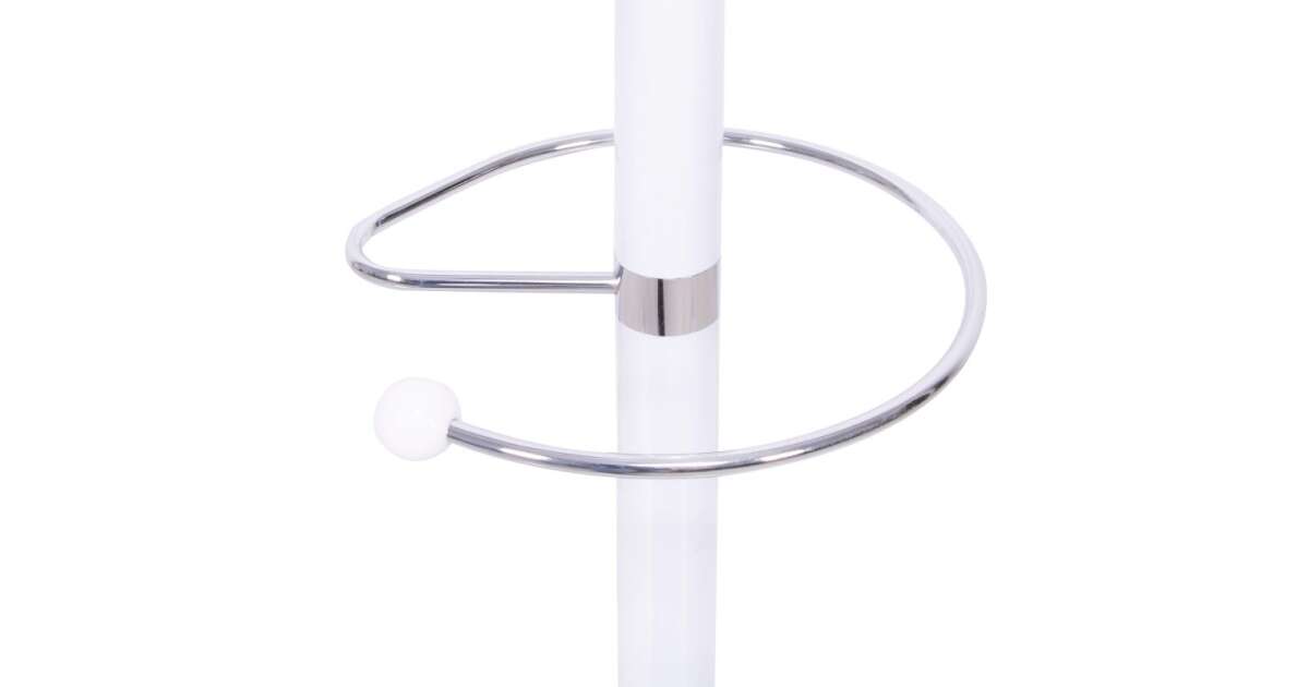 Ova elegantna bijela samostojeća vješalica visoka 176 cm idealan je izbor za predsoblje, ured ili kancelariju. Stabilno mramorno postolje osigurava siguran oslonac, dok koso postavljeni, zaobljeni vješalice sprečavaju klizanje i oštećenje odjeće. Držač za kišobrane praktičan je dodatak za jednostavno spremanje kišobrana.