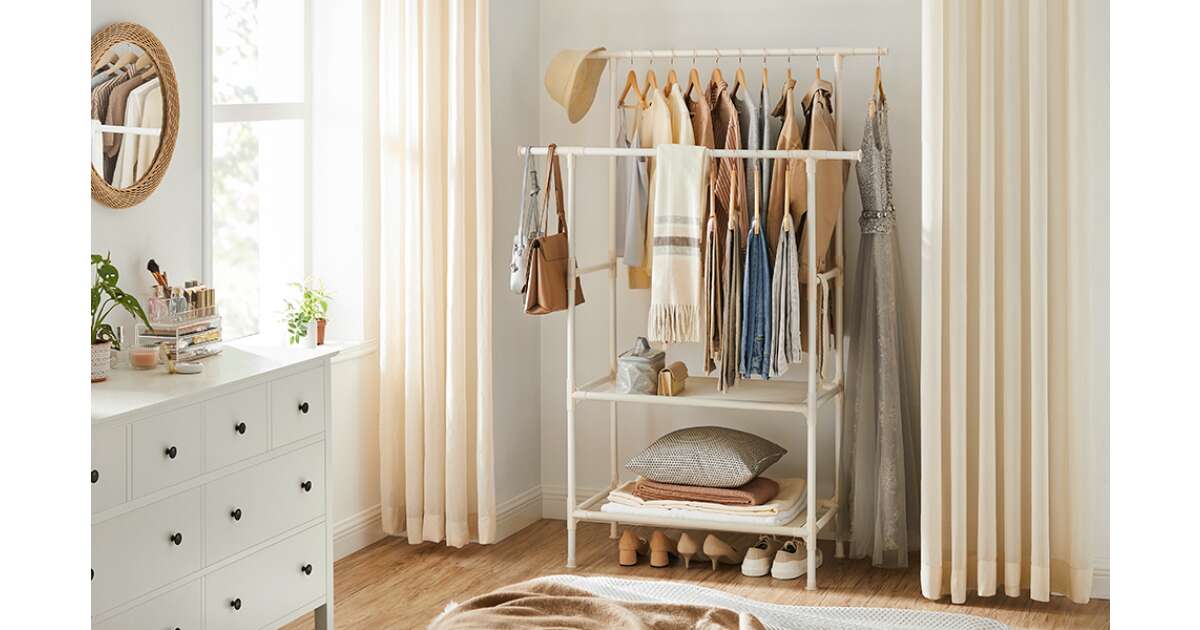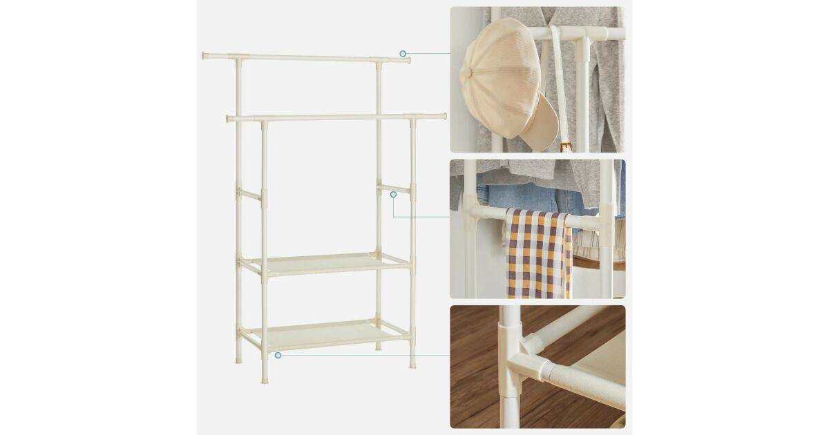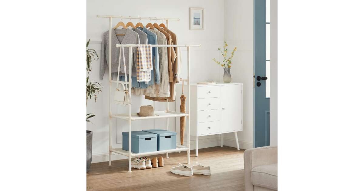 Ova SONGMICS vješalica za odjeću idealan je izbor za uredno spremanje vaše odjeće, torbi i cipela. Ima dvije gornje šipke, dvije donje police i elegantan bijeli dizajn.