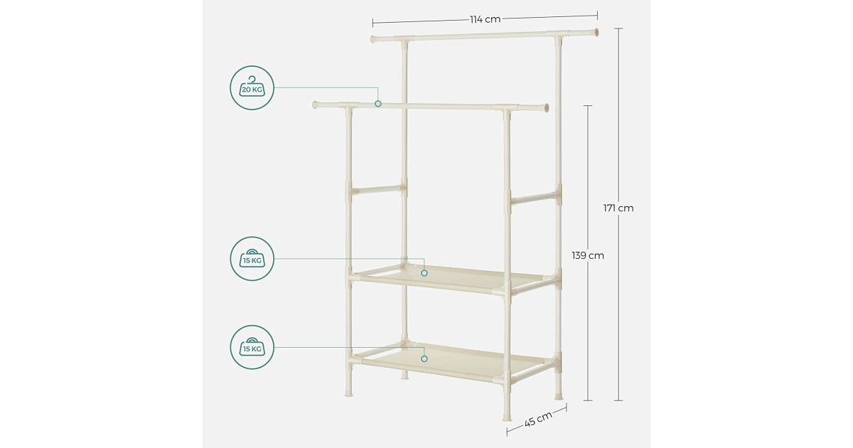 SONGMICS Vješalica za odjeću - Dvostruka šipka - 2 police - 114x45x171 cm s opisom