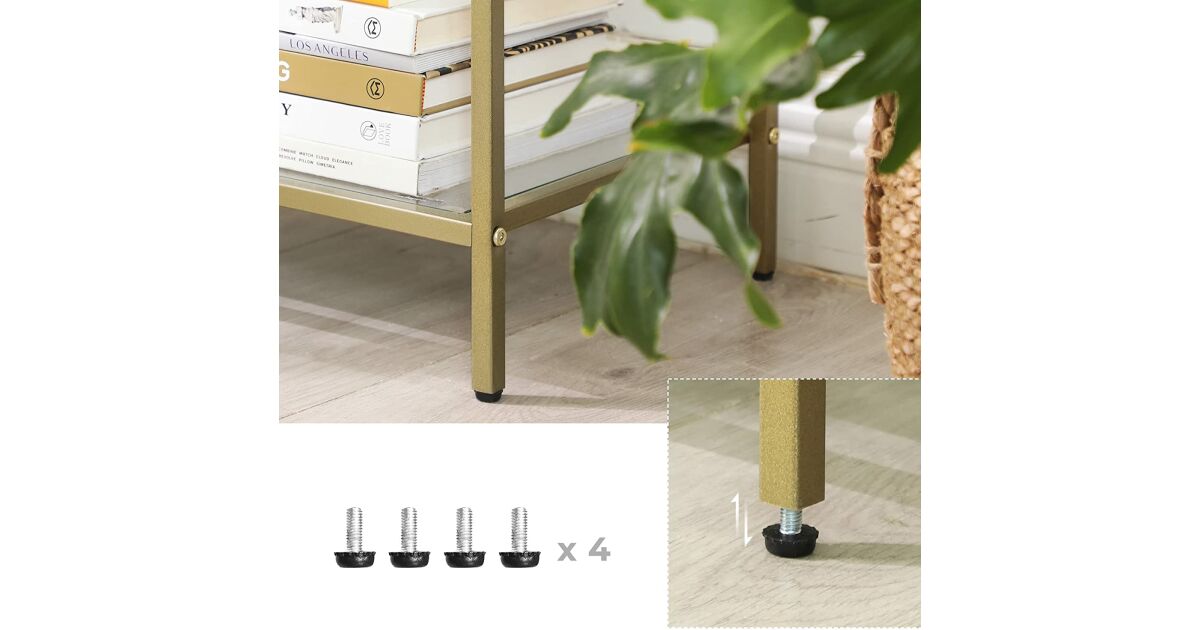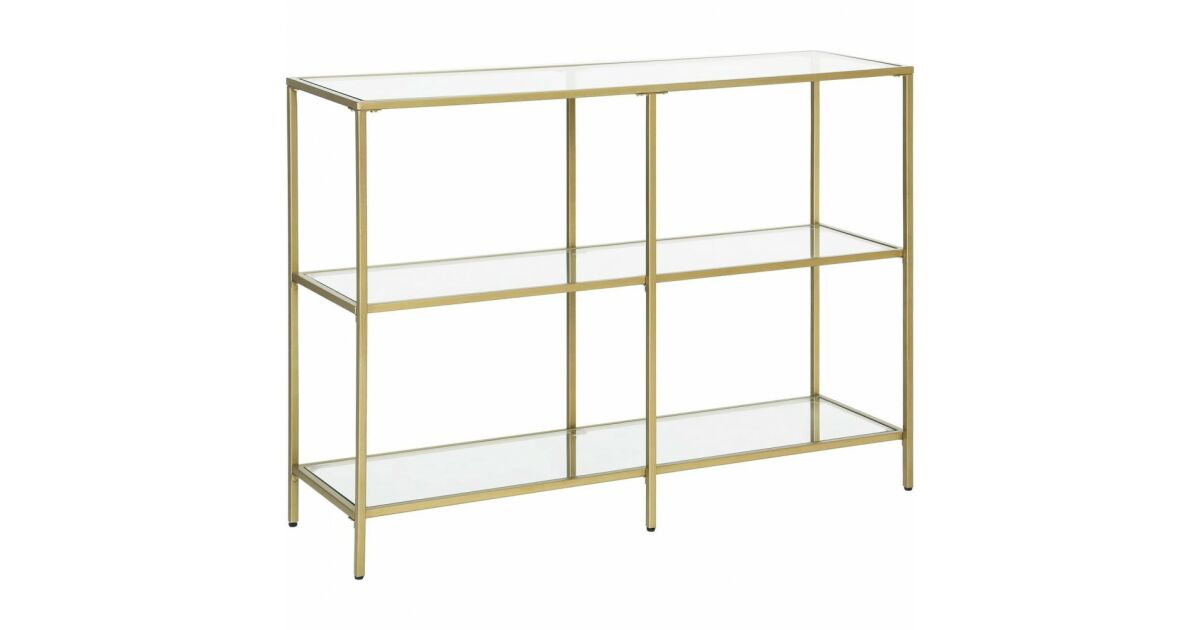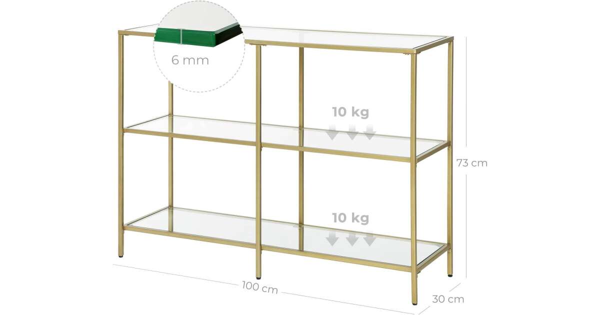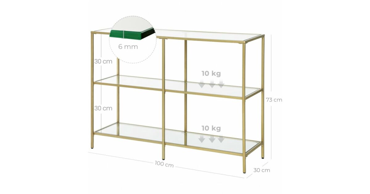Ovaj elegantni i praktični VASAGLE stol za hodnik savršen je izbor za moderne domove. Zlatni metalni okvir i prozirne police od kaljenog stakla daju elegantan izgled, a istovremeno pružaju dovoljno prostora za pohranu dekoracija, knjiga i drugih predmeta. Zahvaljujući 3 police, imat ćete puno mjesta za sve svoje dragocjenosti.