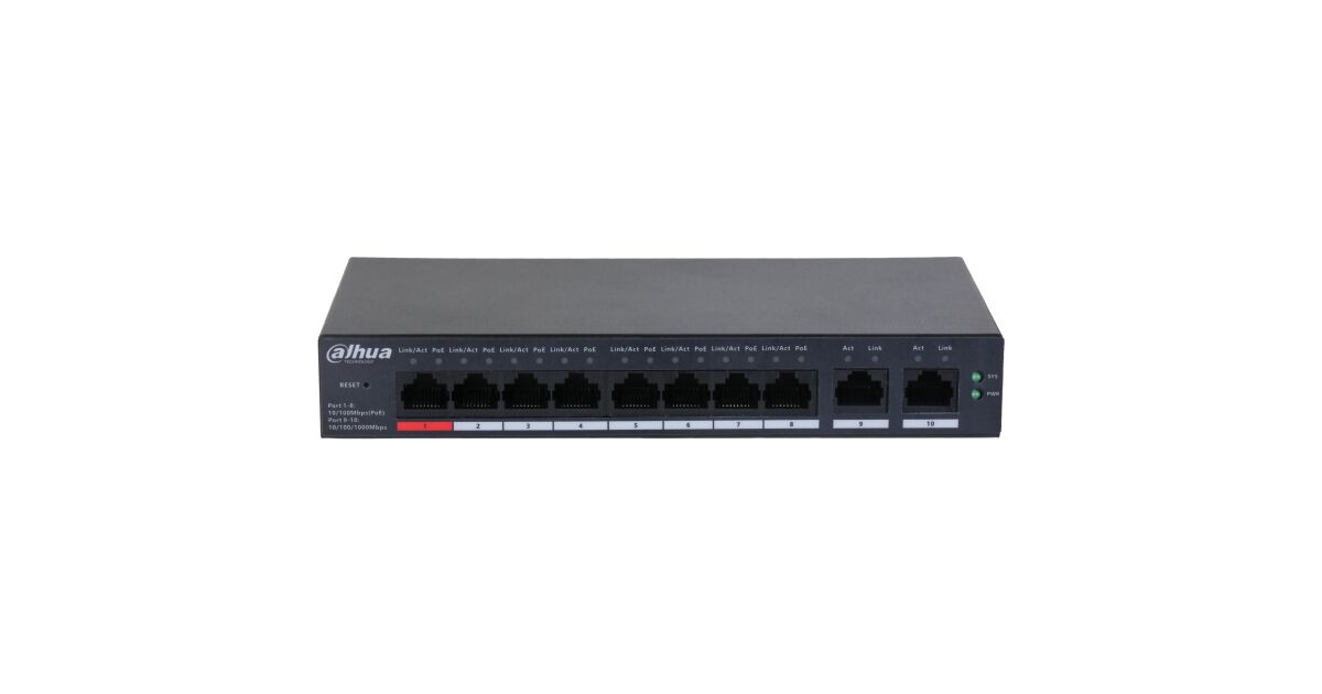 Ovaj Dahua DH-CS4010-8ET-110 8-portski mrežni prekidač idealno je rješenje za izgradnju kućnih ili malih poslovnih mreža. Brzi Ethernet (10/100 Mbps) osigurava brzinu, a PoE (Power over Ethernet) funkcijom jednostavno možete napajati IP kamere, telefone i druge PoE-kompatibilne uređaje. Crna boja daje mu elegantan izgled.