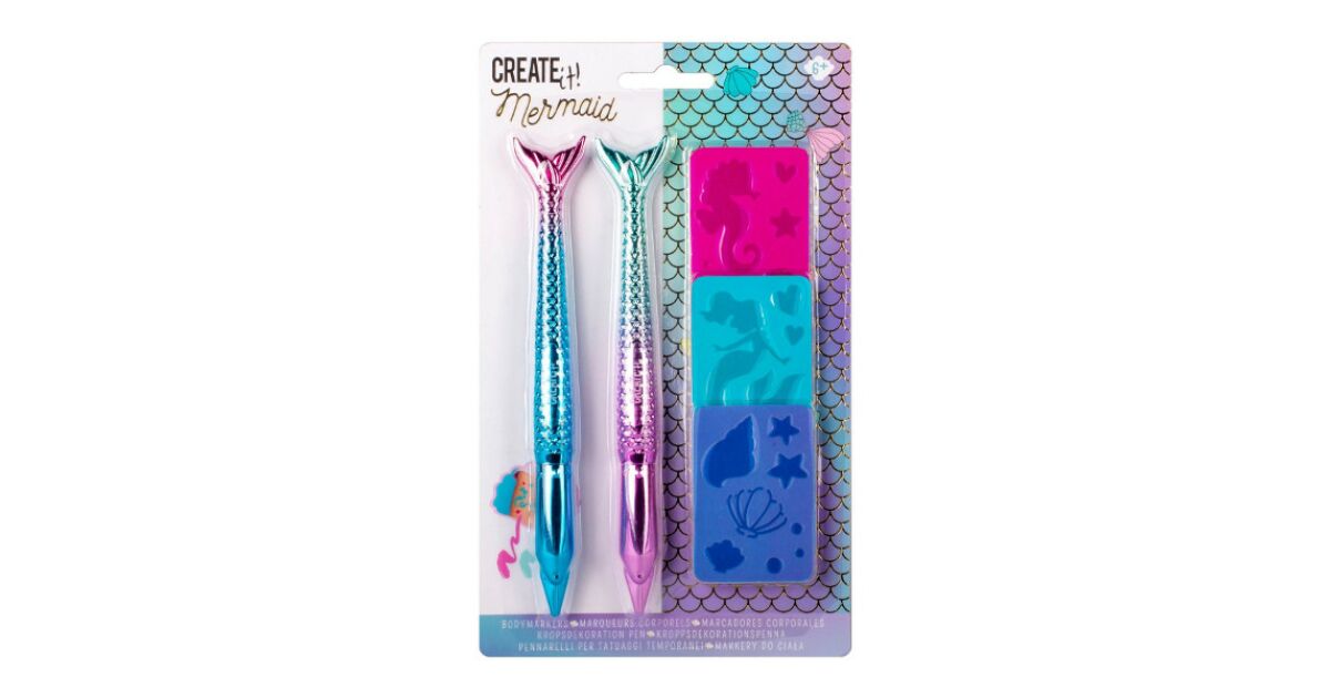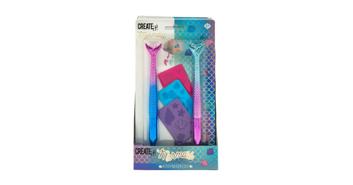Ovaj zabavni Create It! set za oslikavanje tijela s temom morske djevojke savršen je izbor za sve male umjetnike koji obožavaju morska bića i kreativno stvaranje! Set dolazi s dva prekrasna pera s morskim repom sirene i tri različita šablona s morskim motivima.