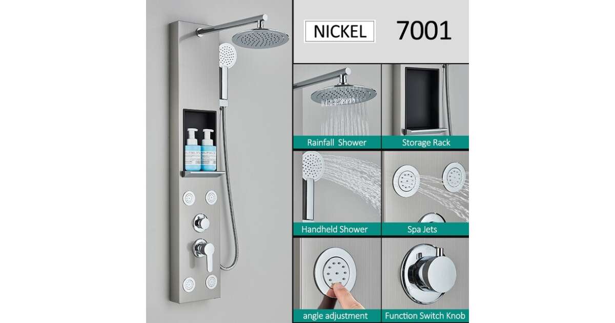 Tuš panel, Blackswan, nikl model tip M7001 s tuš glavom, policom i SPA funkcijama, veličina 111 cm s opisom