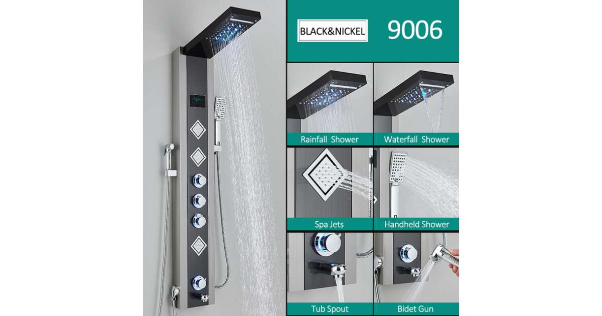 Tuš panel, Blackswan, tip M9006, crni model s LED zaslonom, digitalnim zaslonom, slavinom, bide tušem i SPA funkcijama, veličina 125 cm s opisom