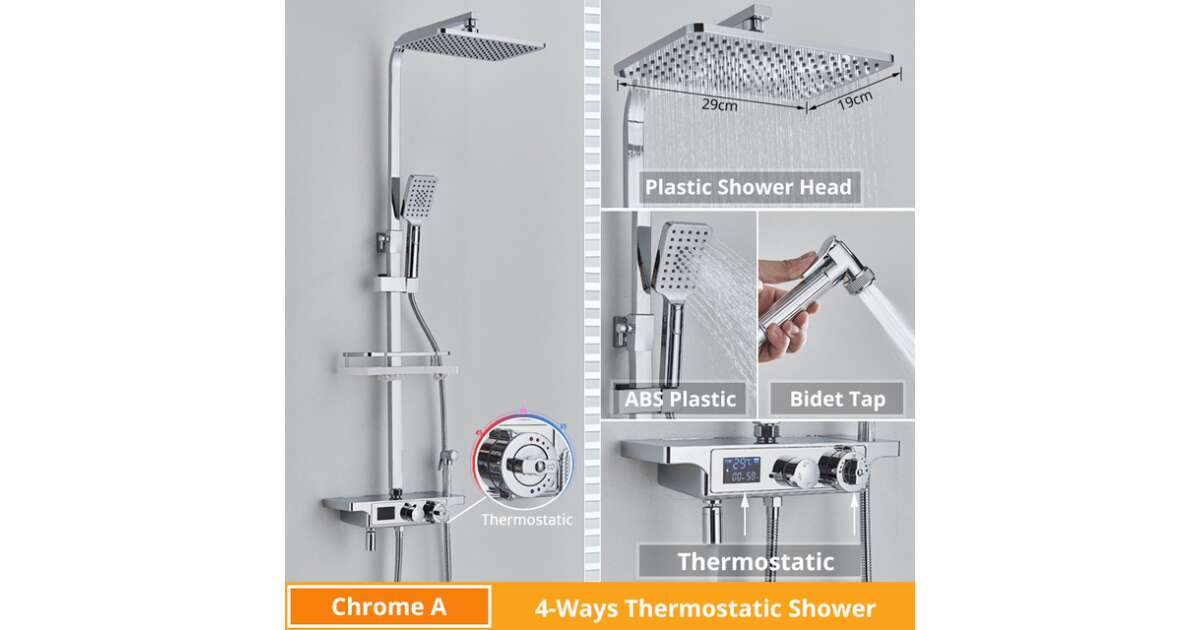 Tuš stup, Blackswan, tip M214, kromirani model, s 4-smjernim termostatom i skrivenom pomičnom slavinom, LCD zaslonom i tušem pod pritiskom, veličina 116 cm s opisom
