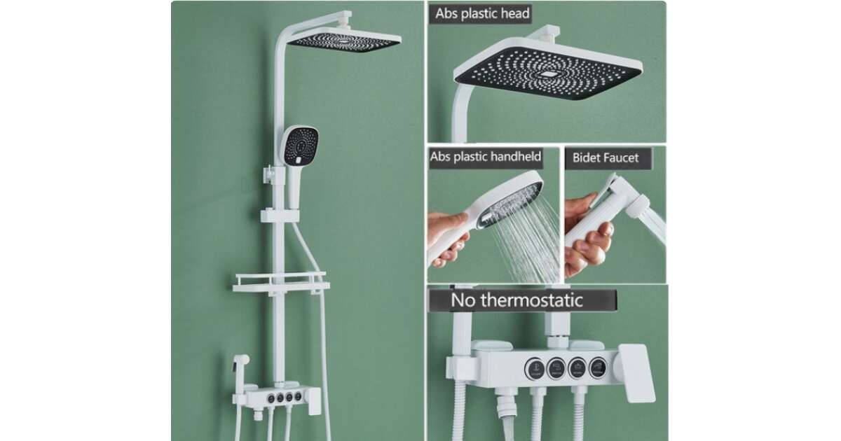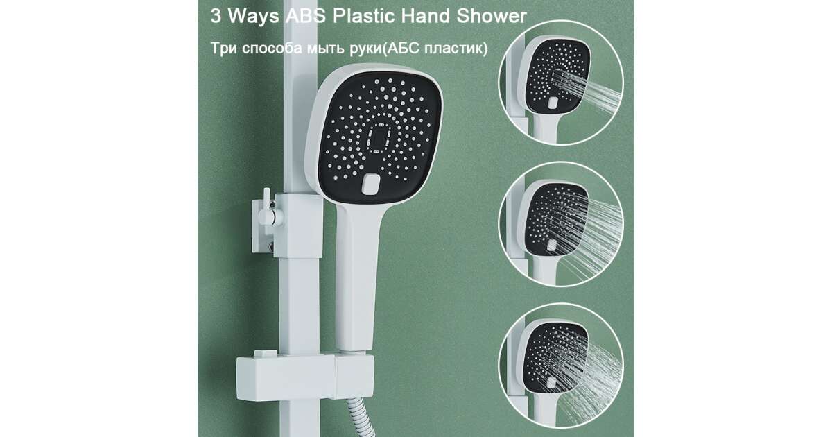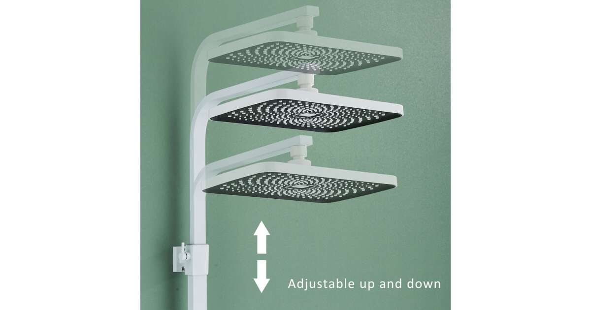 Tuš stup, Blackswan, tip M231, bijeli model, s 4-smjernim tušem s pritiskom, ručnim tušem tipa SPA i skrivenim namještajem, veličina 118 cm s opisom