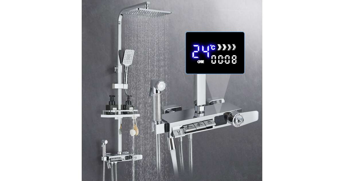Tuš stup, Blackswan, tip M250, sjajni kromirani model, s 4-smjernim termostatom, LCD zaslonom, tušem pod pritiskom i skrivenom mobilnom armaturom, veličina 30 x 20 cm s opisom