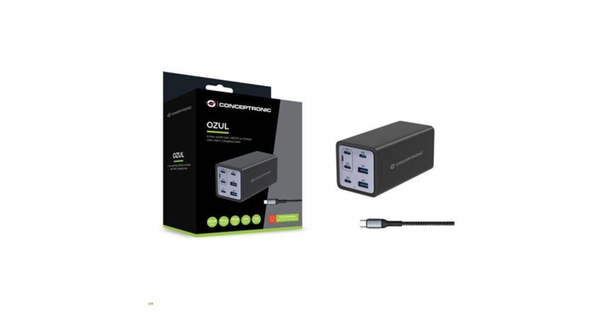 Conceptronic OZUL06BE. Typ ładowarki: Wewnętrzna, Rodzaj zasilania: Prąd przemienny, Kompatybilność ładowarki: Uniwersalne. Napięcie: 100 - 240 V, Napięcie wyjściowe (max): 55 V. Ilość portów USB typu C: 4, Szybkie ładowanie, Funkcje ochrony zasilania: Zabezpieczenie przed przegrzaniem, Przeładowanie, Krótkie spięcie. Kolor produktu: CzarnyWaga [g]: 450;Liczba wyjść USB-A: 2;Quick Charge: Tak;Kolor: Czarny;Liczba ładowanych urządzeń: 6;Liczba wyjść USB-C: 4