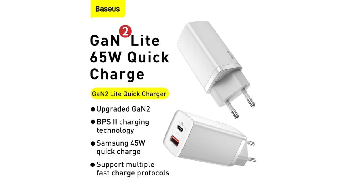 Ładowarka sieciowa Baseus GaN2 Lite, USB + USB-C, 65 W, EU (biała) opis