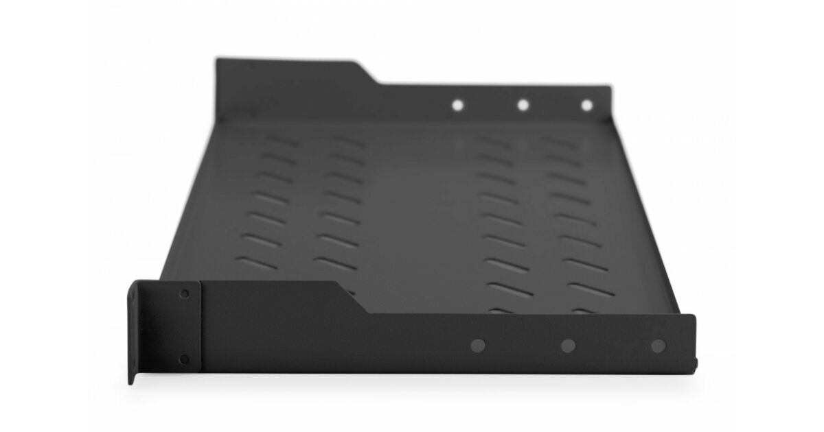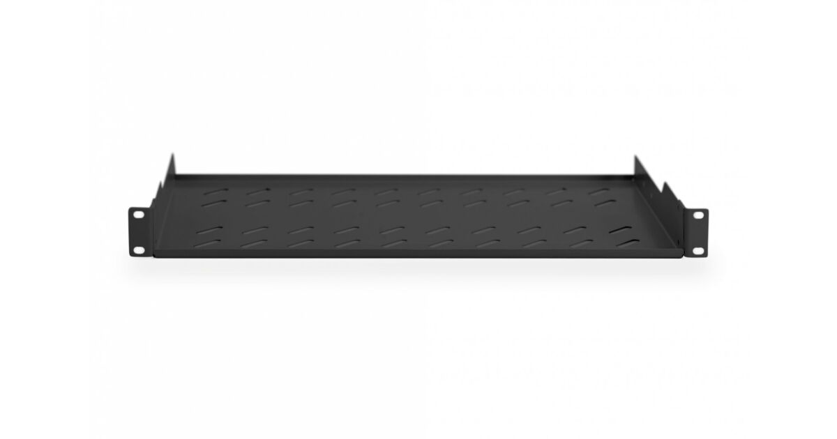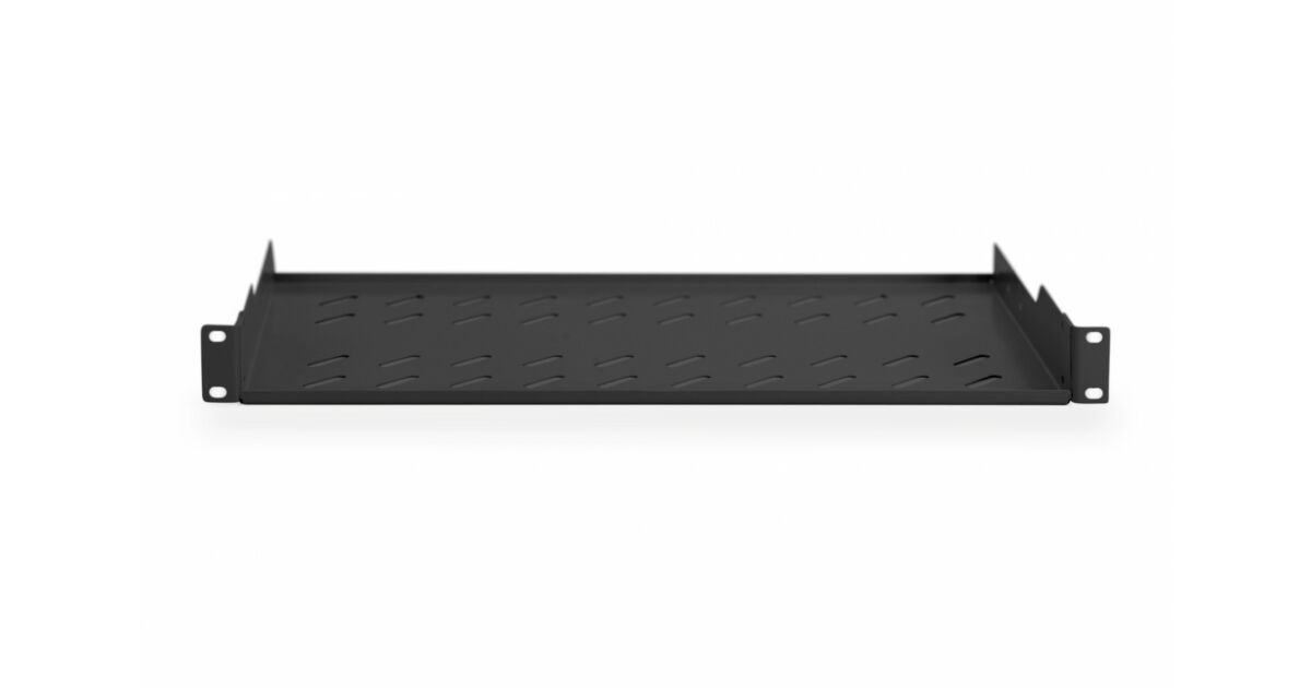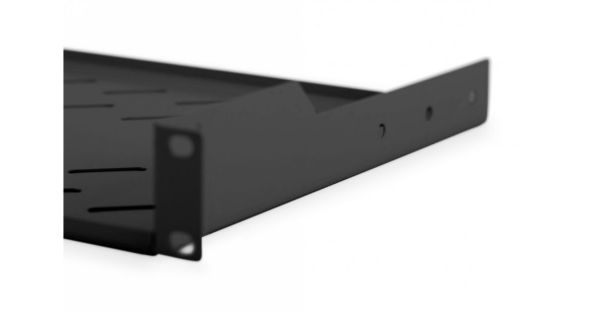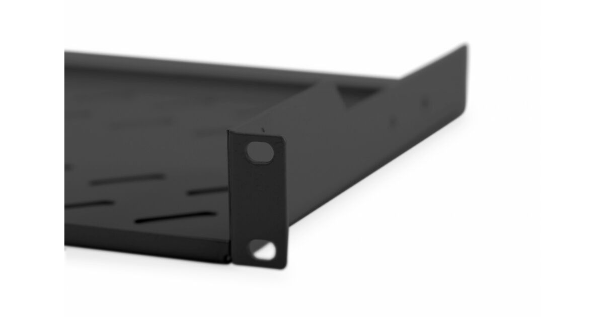 Digitus | Fixed Shelf for Racks | DN-19 TRAY-1-SW | Black | The shelves for fixed mounting can be installed easy on the two front 483 mm (19“) profile rails of your 483 mm (19“) network- or server cabinet. Due to their stable, perforated steel sheet with a high load capacity, they are the optimal surface for components which are not 483 mm (19”) suitable